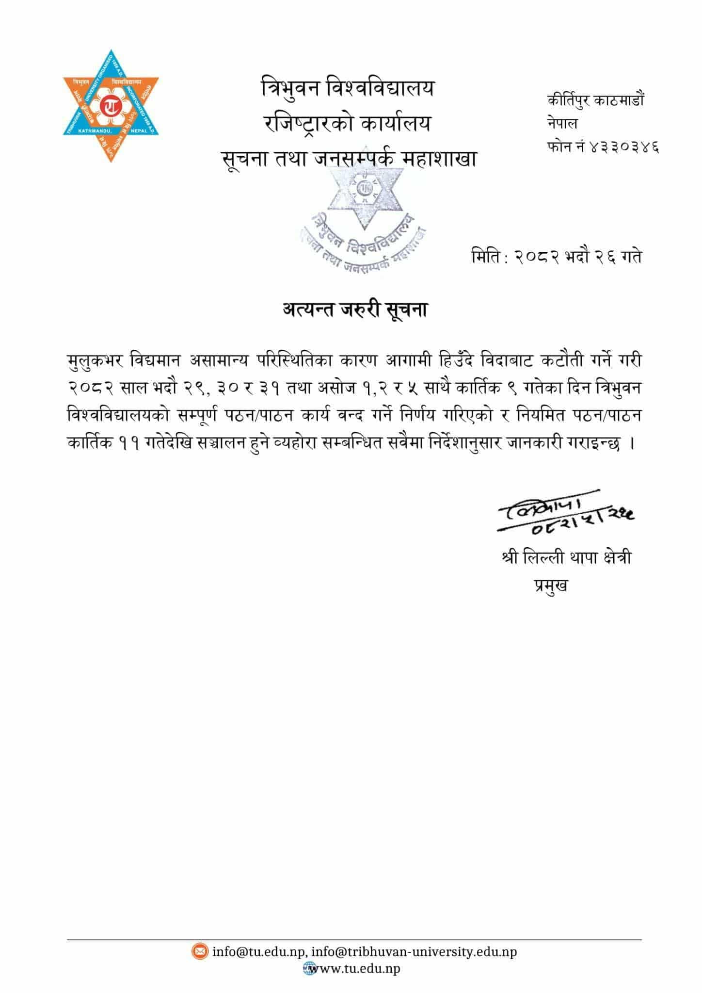 ‘मुलुकभर विद्यमान असामान्य परिस्थितिका कारण आगामी हिउँदे बिदाबाट कटौती गर्ने गरी २०८२ साल भदौ २९, ३० र ३१ तथा असोज १,२ र ५ साथै कार्तिक ९ गतेका दिन त्रिभुवन विश्वविद्यालयको सम्पूर्ण पठनपाठन कार्य बन्द गर्ने निर्णय गरिएको र नियमित पठन पाठन कार्तिक ११ गतेदेखि सञ्चालन हुने ब्यहोरा सम्बन्धित सवैमा निर्देशानुसार जानकारी गराइन्छ ।’ सूचना तथा जनसम्पर्क महाशाखाको विज्ञप्तिमा उल्ल्लेख छ । जेनजीको आन्दोलन र त्यसपछि उत्पन्न परिस्थितिका कारण देशभरको पठनपाठन ठप्प भएको छ ।