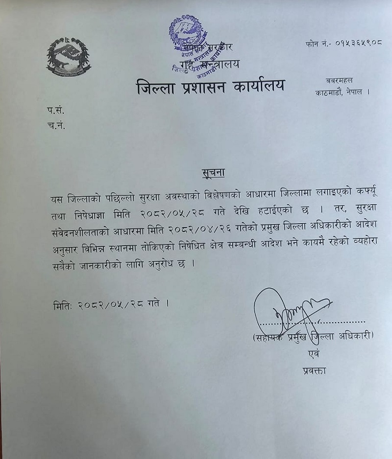 काठमाडौं – काठमाडौं उपत्यकाका तीनवटै जिल्ला काठमाडौं, ललितपुर र भक्तपुरमा लगाइएको कर्फ्यू र निषेधाज्ञा हटाइएको छ। सम्बन्धित जिल्ला प्रशासन कार्यालयहरूले सुरक्षा विश्लेषणपछि विज्ञप्ति जारी गर्दै आदेश फिर्ता लिएका हुन्।