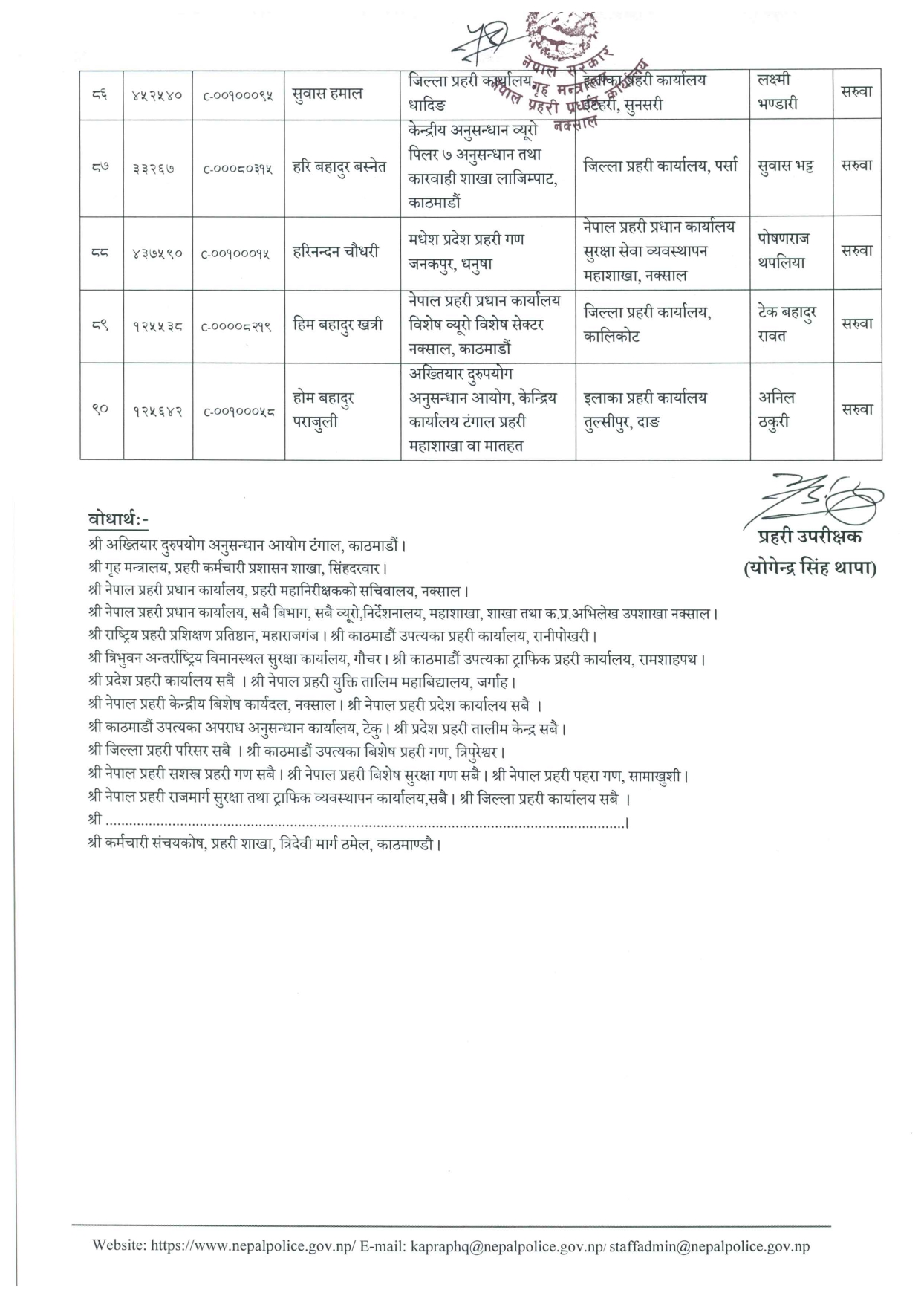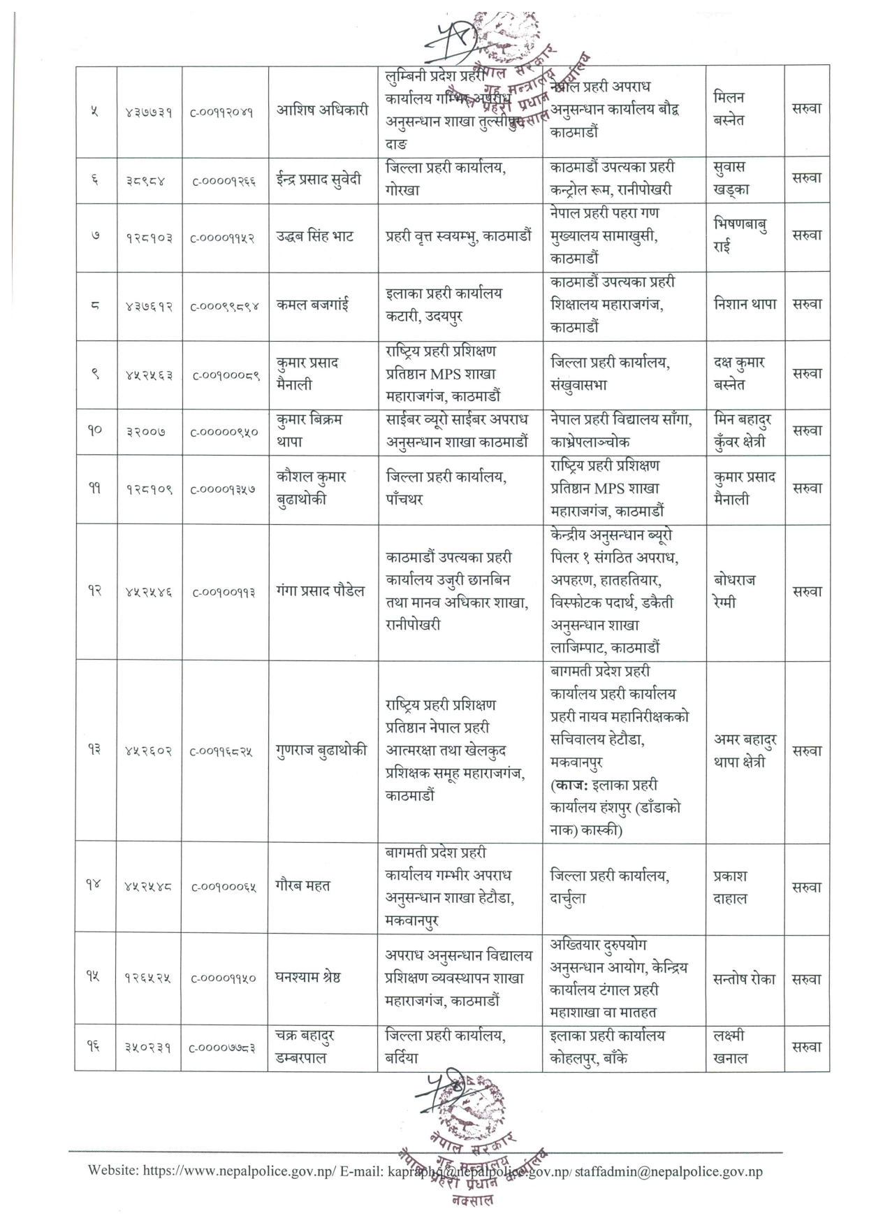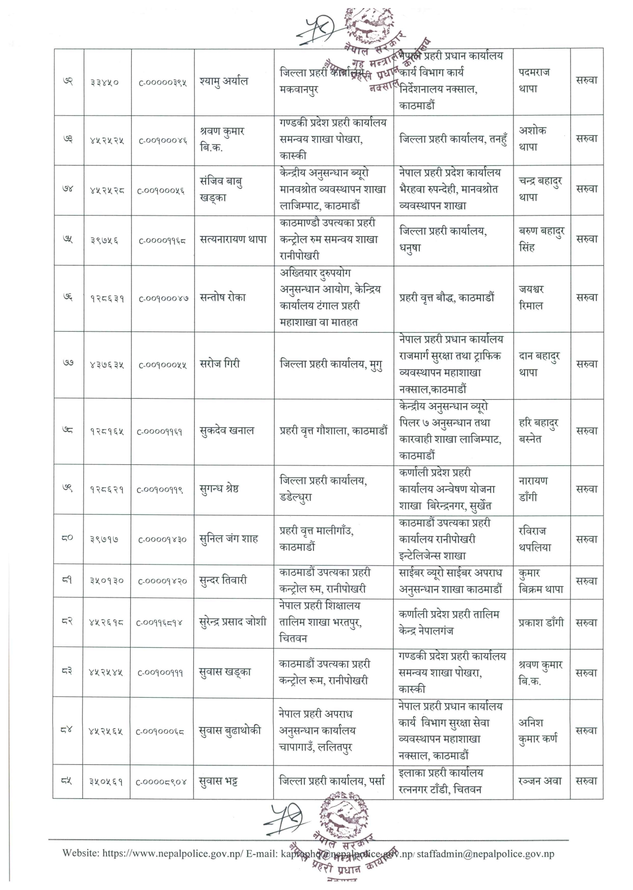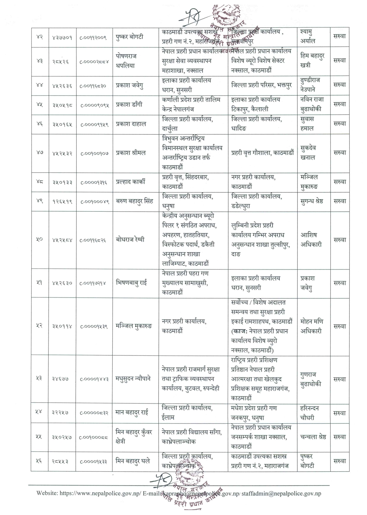 सरुवा हुनेहरूमा काठमाडौँ उपत्यकाका बृत्तसहित विभिन्न कार्यालय र जिल्लाहरू छन्। केही जिल्लामा, इलाकामा र वृत्तमा इन्चार्ज हेरफेर भएका छन्।