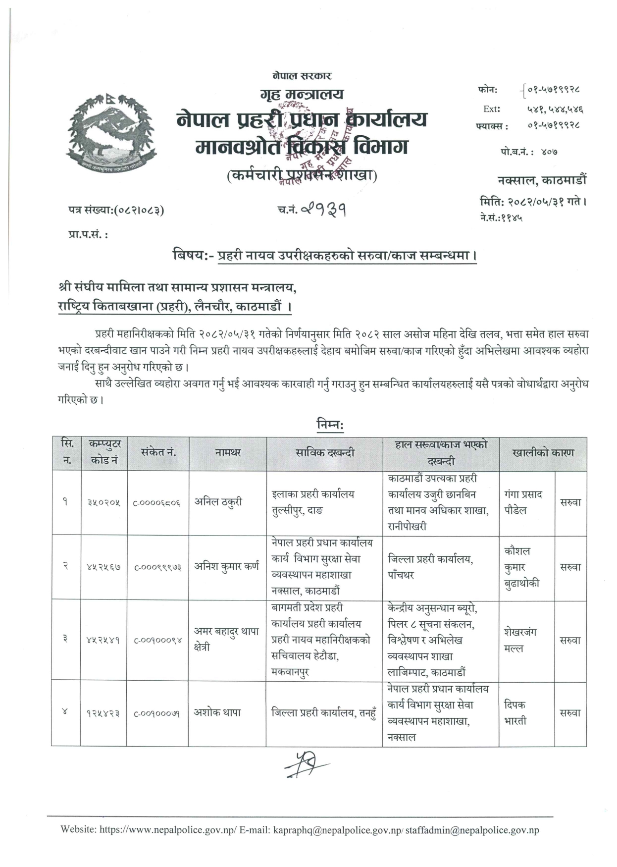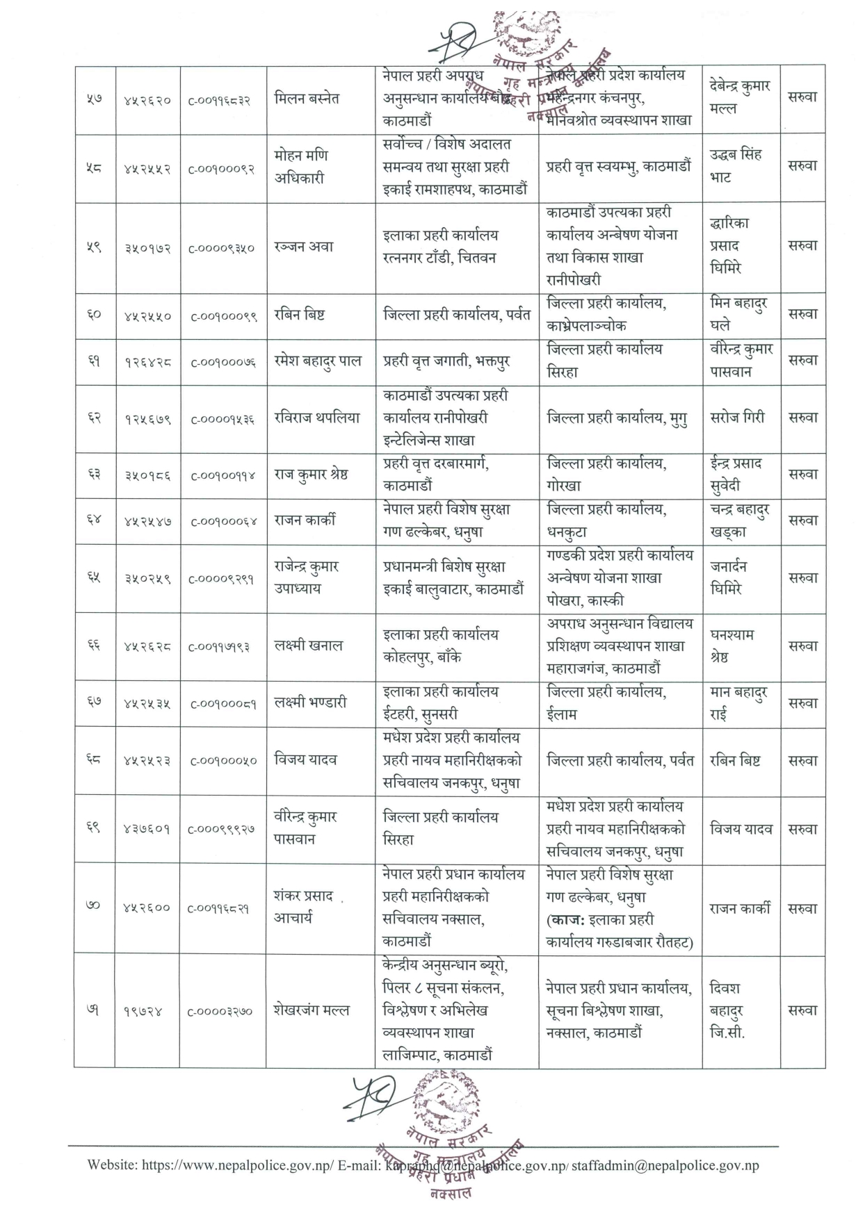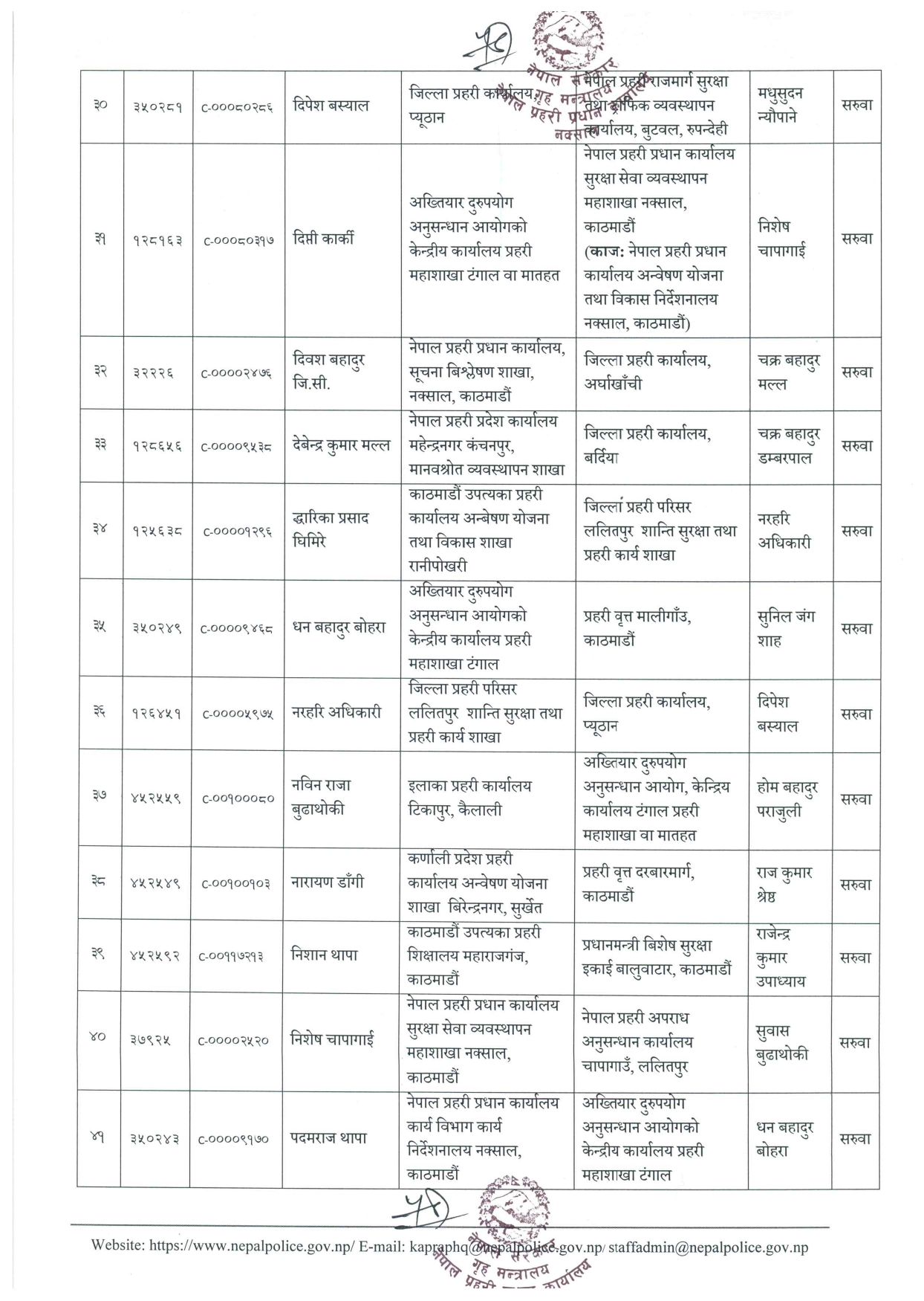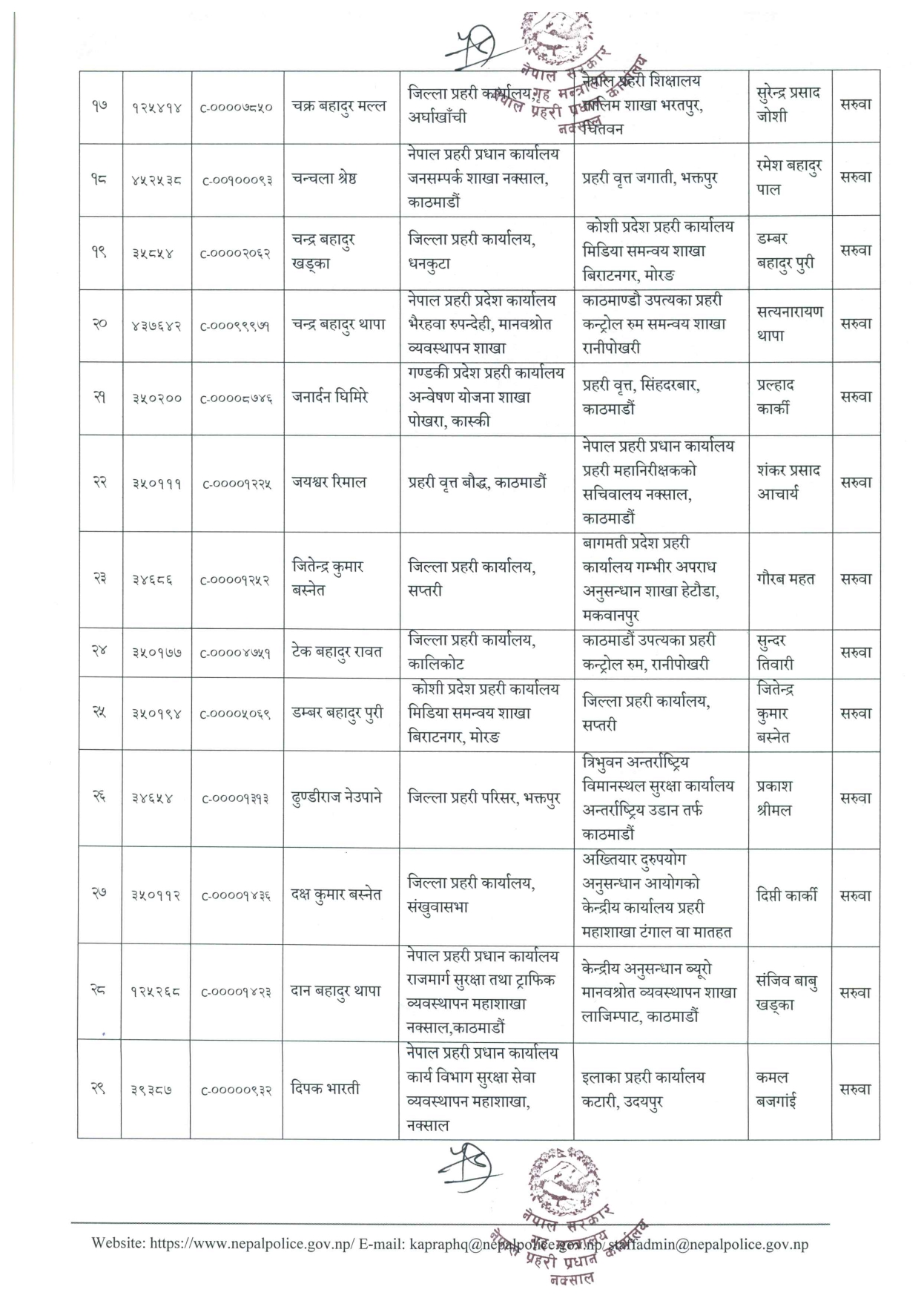 सरुवा हुनेहरूमा काठमाडौँ उपत्यकाका बृत्तसहित विभिन्न कार्यालय र जिल्लाहरू छन्। केही जिल्लामा, इलाकामा र वृत्तमा इन्चार्ज हेरफेर भएका छन्।