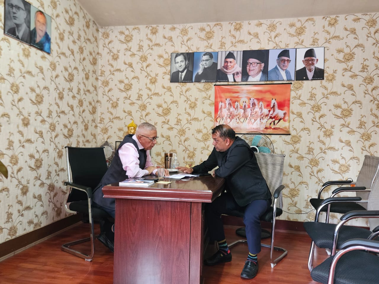 उपसभापति खड्का नेता कोइरालालाई भेट्न उनकै सम्पर्क कार्यालयमा आएका थिए । महामन्त्री थापासँग भने बाहिर भेट भएको कोइराला निकट स्रोतले जानकारी दियो ।