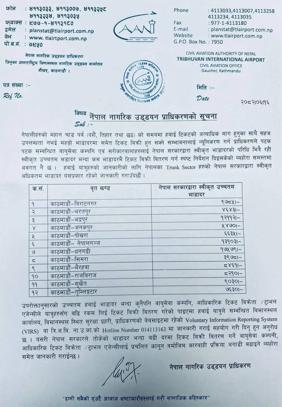 काठमाडौँ – यात्रु हितको नाममा बारम्बार वायुसेवा कम्पनीलाई भाडा दर नबढाउन निर्देशन दिने नेपाल नागरिक उड्डयन प्राधिकरणले नै आन्तरिक हवाइ मार्गमा चर्को भाडा तोक्दै सूची सार्वजनिक गरेपछि आलोचना सुरु भएको छ। बिहीबार सार्वजनिक गरिएको नयाँ सूचीअनुसार काठमाडौं–धनगढीको अधिकतम भाडा १७ हजार ५७९ रुपैयाँ, काठमाडौं–नेपालगञ्ज १३ हजार १०३, काठमाडौं–भद्रपुर १२ हजार ११२ र काठमाडौं–पोखरा ६ हजार ६३५ रुपैयाँ तोकिएको छ।
