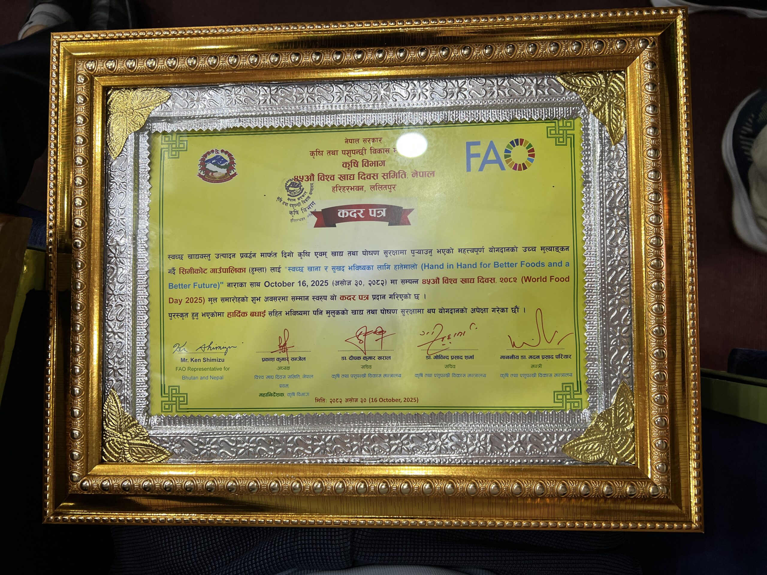 काठमाडौँ – “स्वच्छ खाना र सुखद् भविष्यका लागि हातेमालो” भन्ने मूल नाराका साथ मनाइएको ४५औँ विश्व खाद्य दिवस–२०२५ को अवसरमा नेपाल सरकारको कृषि तथा पशुपन्छी विकास मन्त्रालय र कृषि विभागले अपिहिमाल गाउँपालिका (दार्चुला) लाई सुदूरपश्चिम प्रदेशको उत्कृष्ट पालिकाको रूपमा सम्मान गरेको छ।