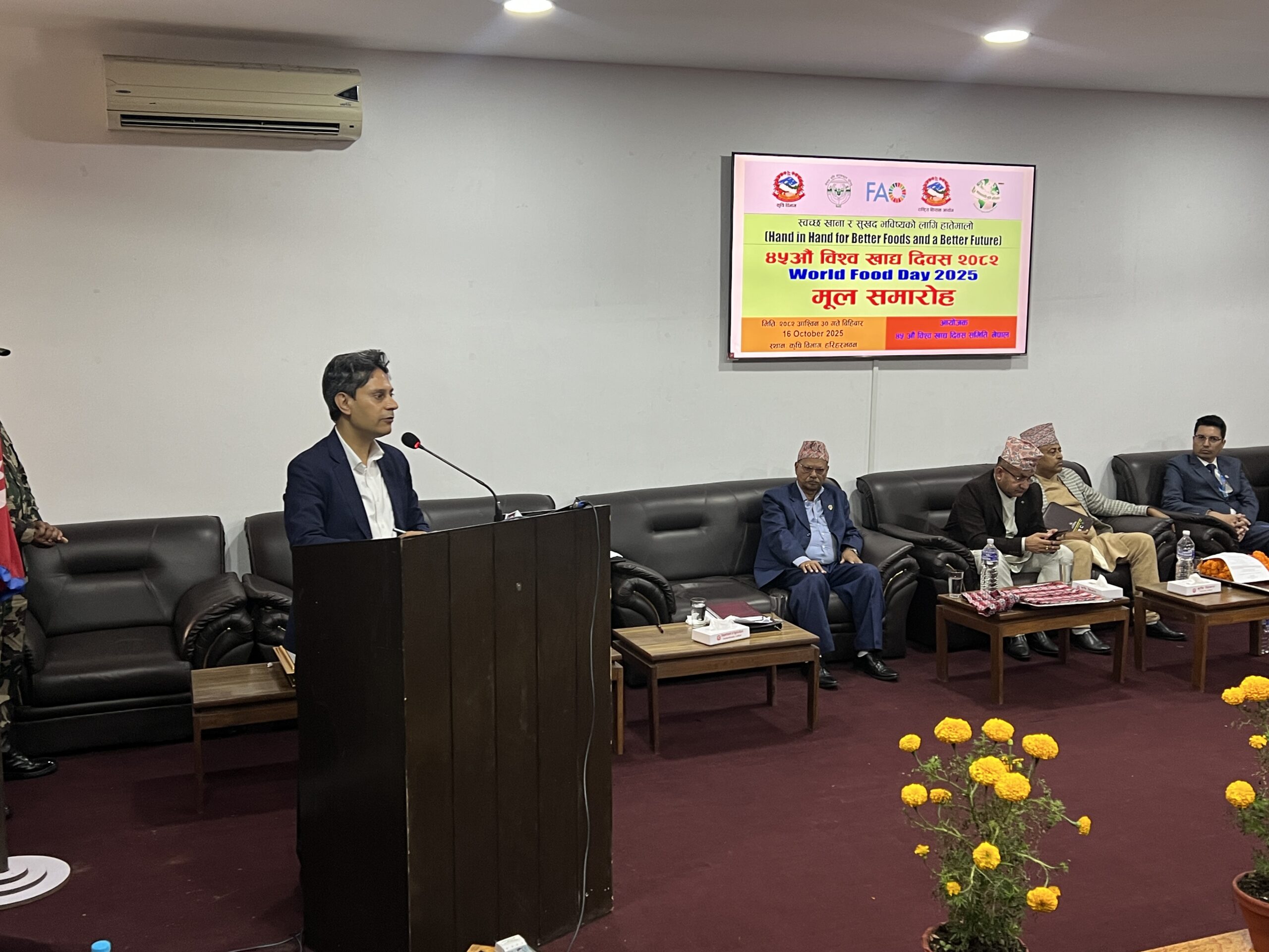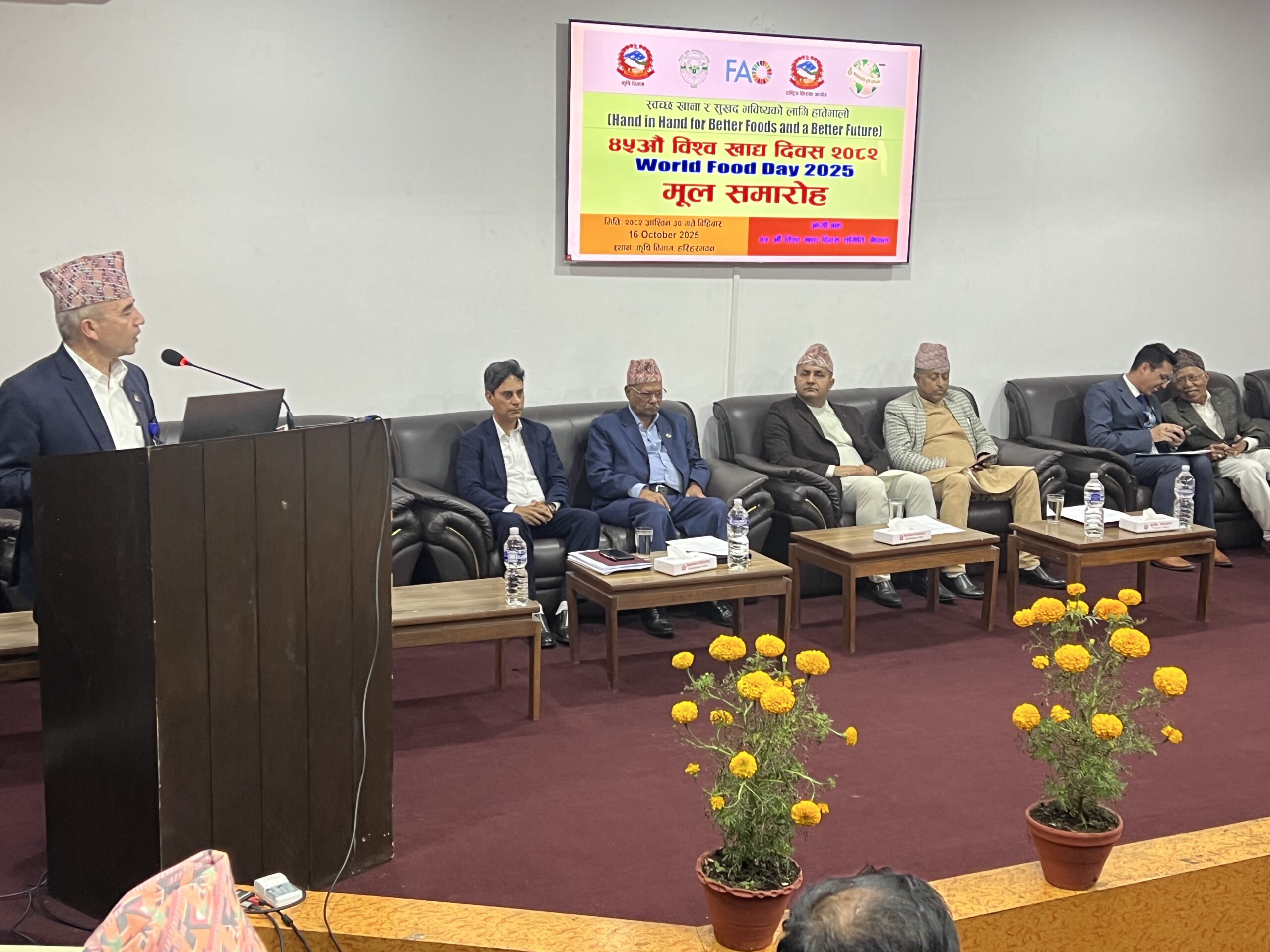 कार्यक्रममा बोल्दै कृषि मन्त्रालयका सचिव डा. गोविन्द प्रसाद शर्माले उत्पादन वृद्धिसँगै खाद्य गुणस्तरमा सुधार नगरेसम्म स्वास्थ्य र वातावरणीय संकट बढ्ने चेतावनी दिए। उनका अनुसार, “खाद्य उत्पादनमा मात्र होइन, यसको भण्डारण, प्रशोधन र वितरणमा पनि स्वच्छता र सुरक्षाको मापदण्ड पालना हुन आवश्यक छ।”  त्यस्तै अर्का सचिव डा. दीपक कुमार खरालले विश्व खाद्य दिवसले कृषक, उपभोक्ता र राज्यबीचको सहकार्यलाई सुदृढ बनाउने बताए। उनले भने, “हामीले स्वस्थ खानेकुरा उत्पादन गर्ने कृषकलाई सम्मान गर्नुपर्छ, र उपभोक्तालाई सही जानकारी र विकल्प उपलब्ध गराउनुपर्छ। यसरी मात्र खाद्य प्रणाली सन्तुलित र दिगो बन्छ।”