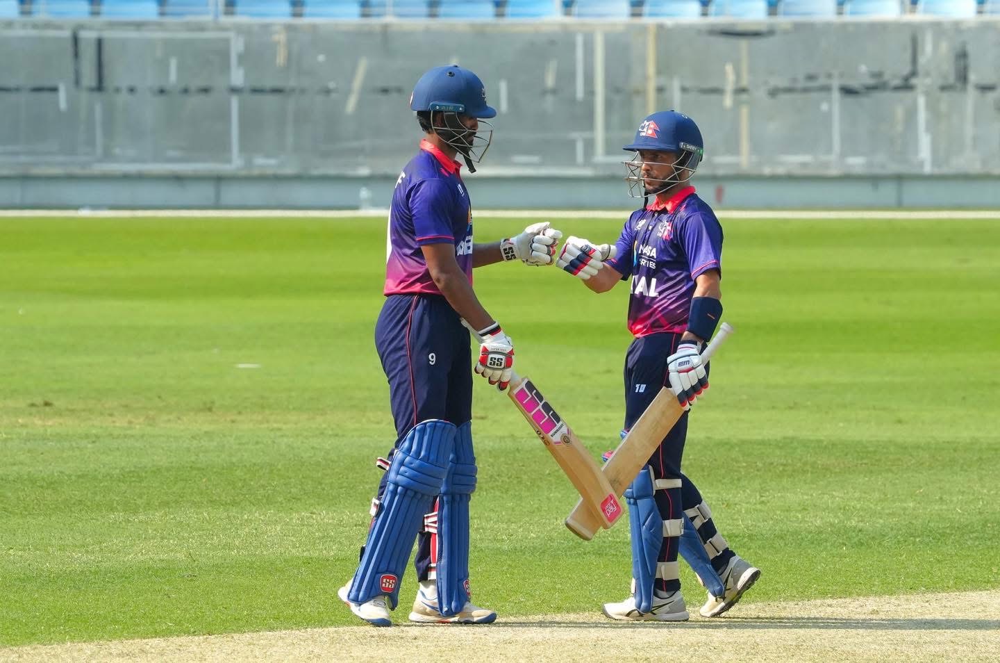 नेपालका दीपेन्द्रसिंह ऐरीले उत्कृष्ट प्रदर्शन गर्दै ७५ रनको योगदान दिए । त्यस्तै करन केसीले ४९, कुशल भुर्तेलले ४७, भिम सार्कीले ४३ र कप्तान रोहितकुमार पौडेलले ३६ रन जोडे ।