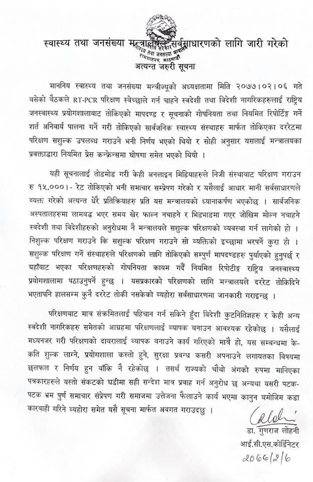 बुधबार डा. गुणराज लोहनीले एक विज्ञप्ति जारी गर्दै केही अनलाइन मिडियाहरुले सूचना तोडमोड गरेर कोरोना परीक्षणका लागि १५ हजार रेट तोकिएको समाचार प्रकाशन बारे गम्भी ध्यानाकष्र्ण भएको बताए छन् । उनले मन्त्रालयले कुनै दररेट नतोकको पनि स्पष्ट पारेका छन् ।
