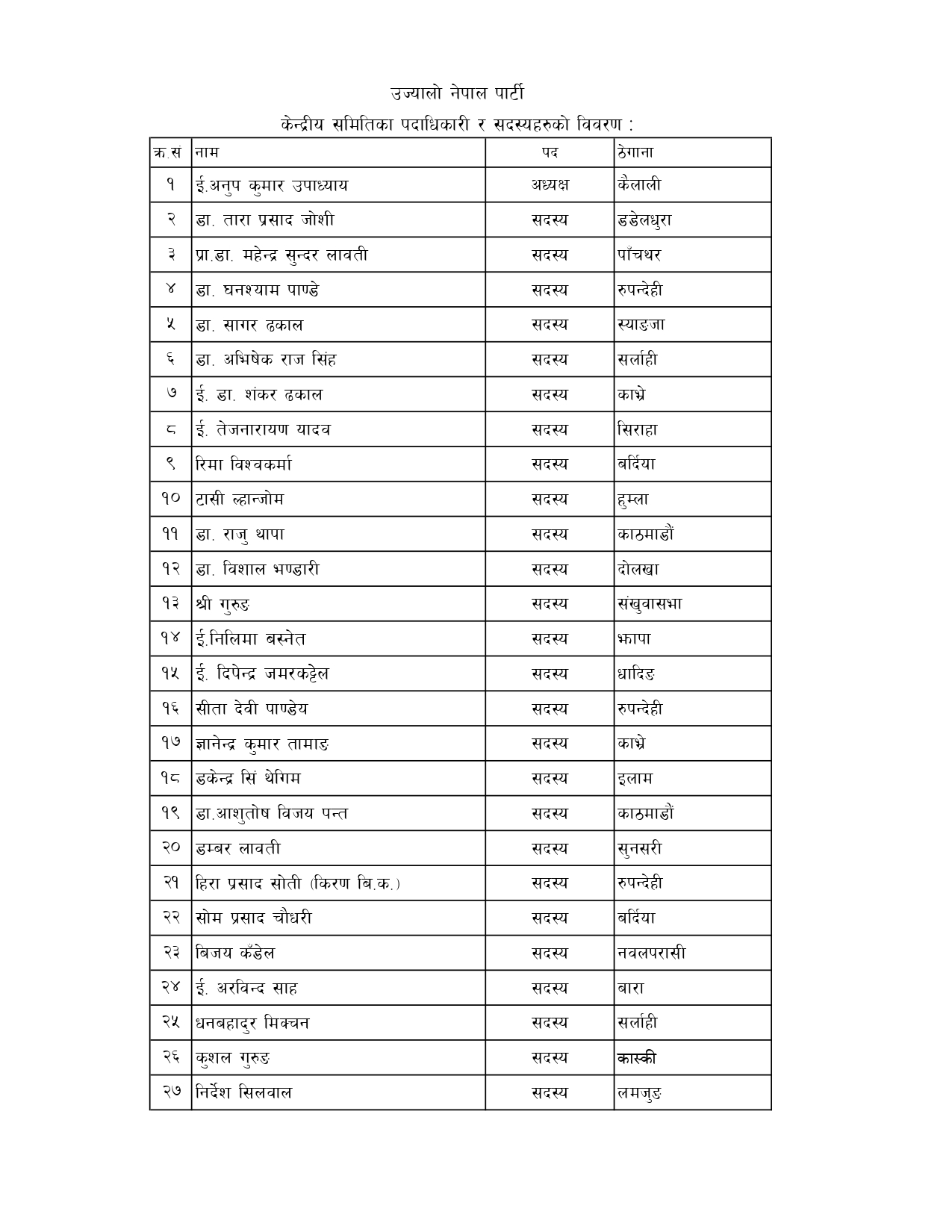 काठमाडौँ – ऊर्जा, भौतिक पूर्वाधार तथा सहरी विकास मन्त्री कुलमान घिसिङ नेतृत्वको ‘उज्यालो नेपाल पार्टी’ ले आफ्ना पदाधिकारी अद्यावधिक गर्न निर्वाचन आयोगमा निवेदन दिएको छ। पार्टीले आयोगमा ५१ सदस्यीय केन्द्रीय समितिको नामावली पेस गरेको हो। नवीन रूपमा अद्यावधिक गरिएको समितिमा डाक्टर र इञ्जिनियरहरूको उल्लेख्य उपस्थिति रहेको छ। पार्टीको अध्यक्षमा इञ्जिनियर तथा पूर्व ऊर्जा सचिव अनुपकुमार उपाध्याय छन्।