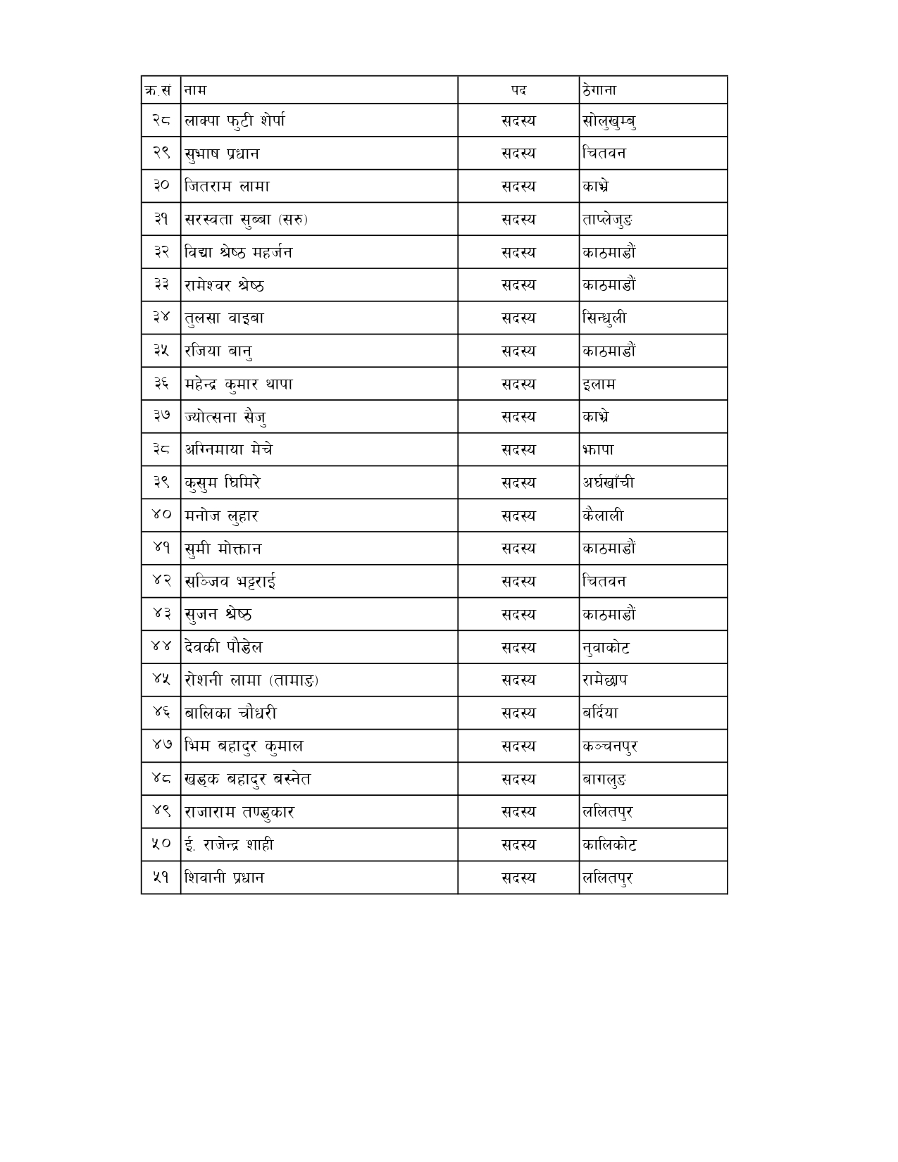 त्यस्तै, सदस्यका रूपमा इञ्जिनियर शंकर ढकाल, तेजनारायण यादव, निलिमा बस्नेत, दिपेन्द्र जमरकट्टेल, अरविन्द साह र राजेन्द्र शाहीको नाम समावेश छ। स्वास्थ्य, शिक्षा र अनुसन्धान क्षेत्रबाट समेत प्रतिनिधित्व गरिएको समितिमा डा. ताराप्रसाद जोशी, डा. महेन्द्रसुन्दर लावती, डा. सागर ढकाल, डा. अभिषेकराज सिंह, डा. राजु थापा, डा. विशाल भण्डारी र डा. आशुतोष विजय पन्त सदस्य रहेका छन्।