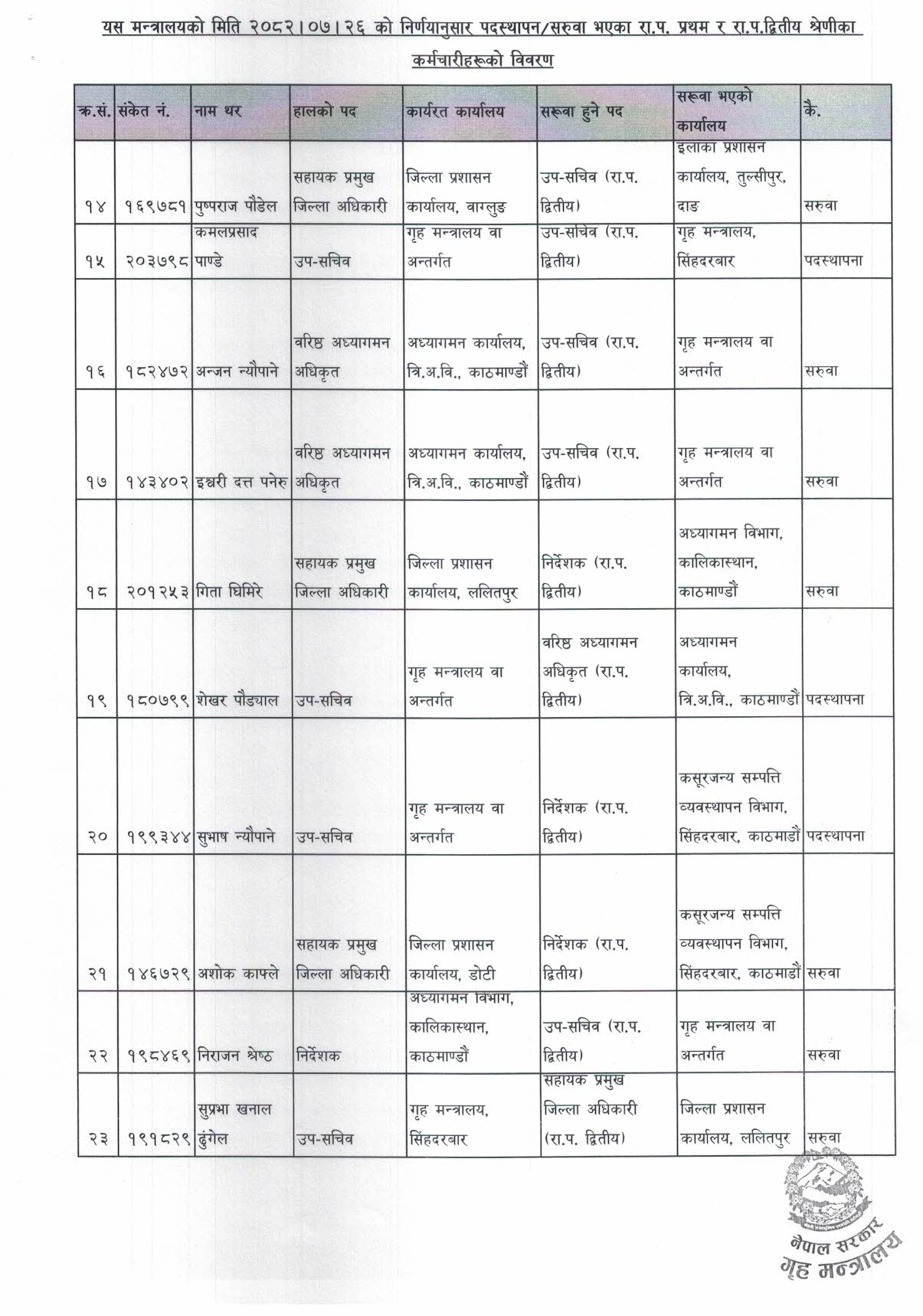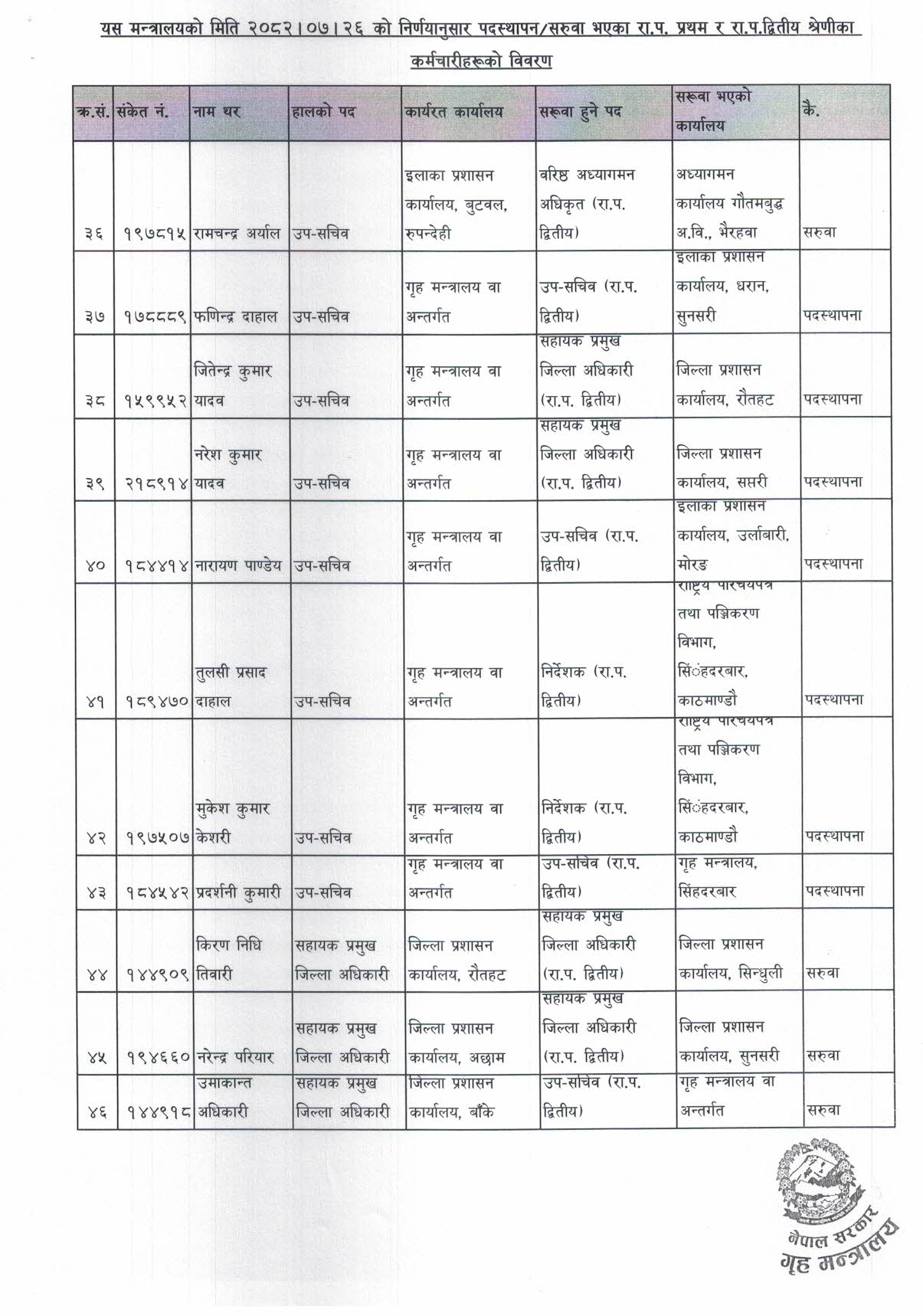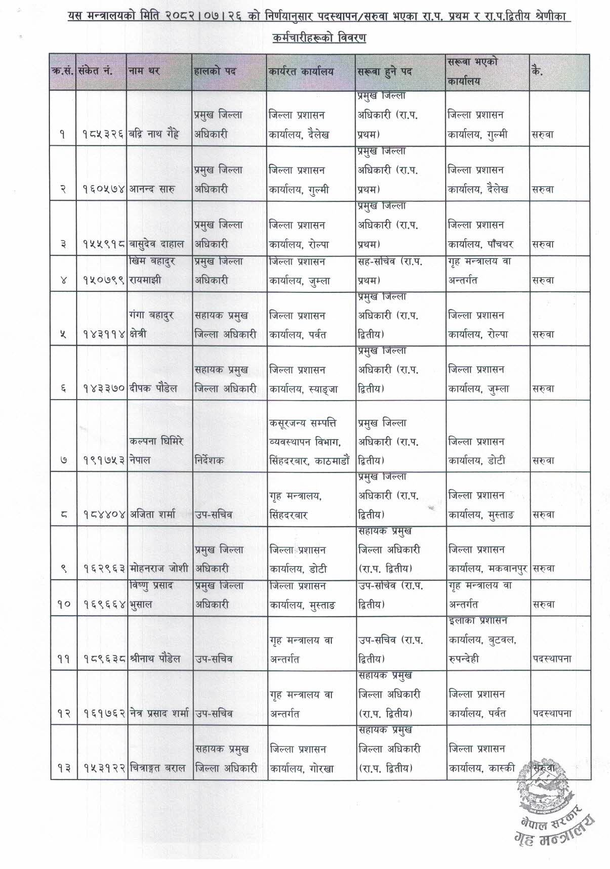 सरुवामध्ये बद्रीनाथ गैह्रेलाई गुल्मीका प्रमुख जिल्ला अधिकारीका रूपमा पठाइएको छ। त्यस्तै, आनन्द सारुलाई दैलेख, बासुदेव दाहाललाई पाँचथर, गंगाबहादुर क्षेत्रीलाई रोल्पा, दीपक पौडेललाई जुम्ला, कल्पना घिमिरे नेपाललाई डोटी र अजिता शर्मालाई मुस्ताङ जिल्लाको प्रमुख जिल्ला अधिकारीका रूपमा सरुवा गरिएको छ।