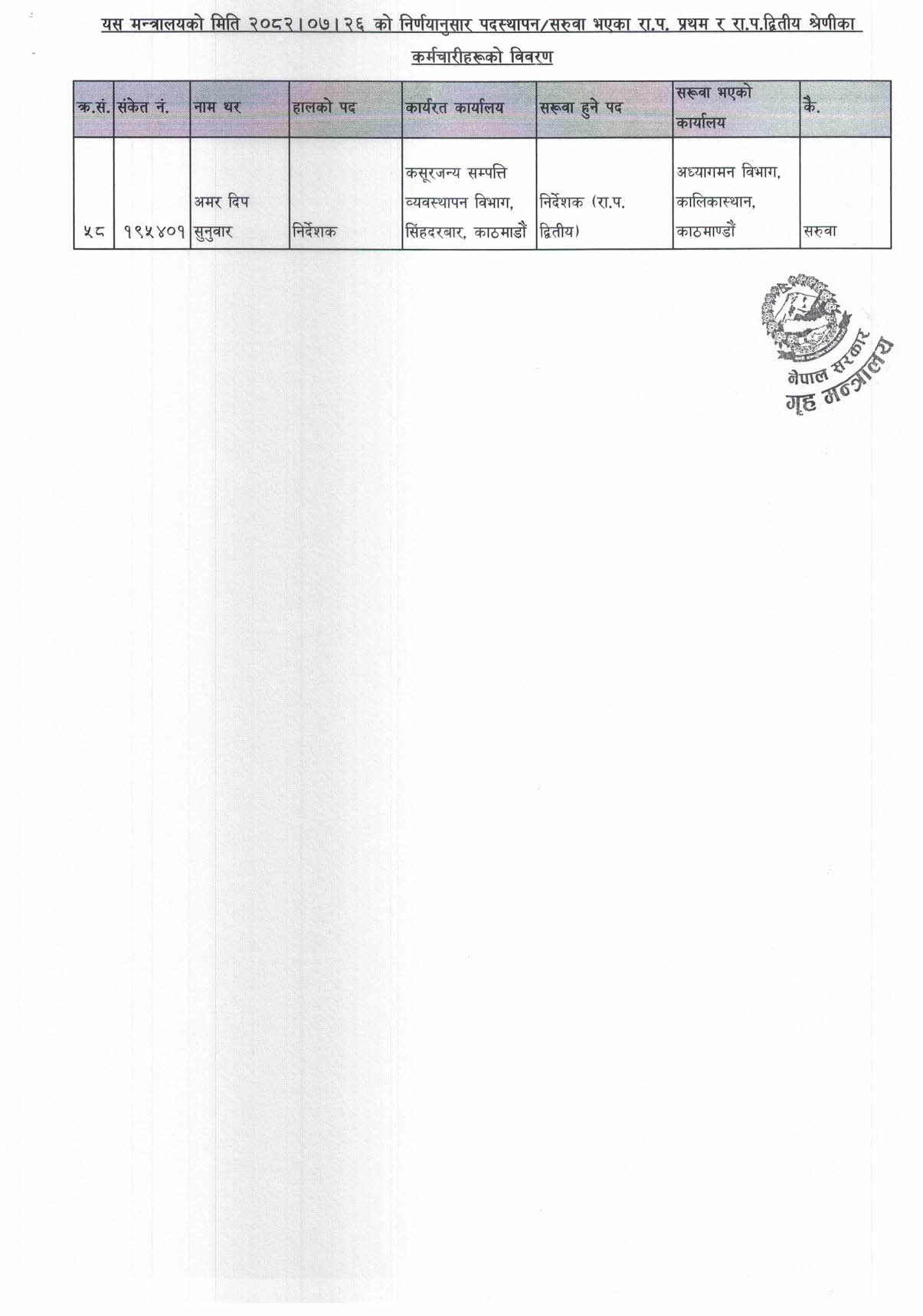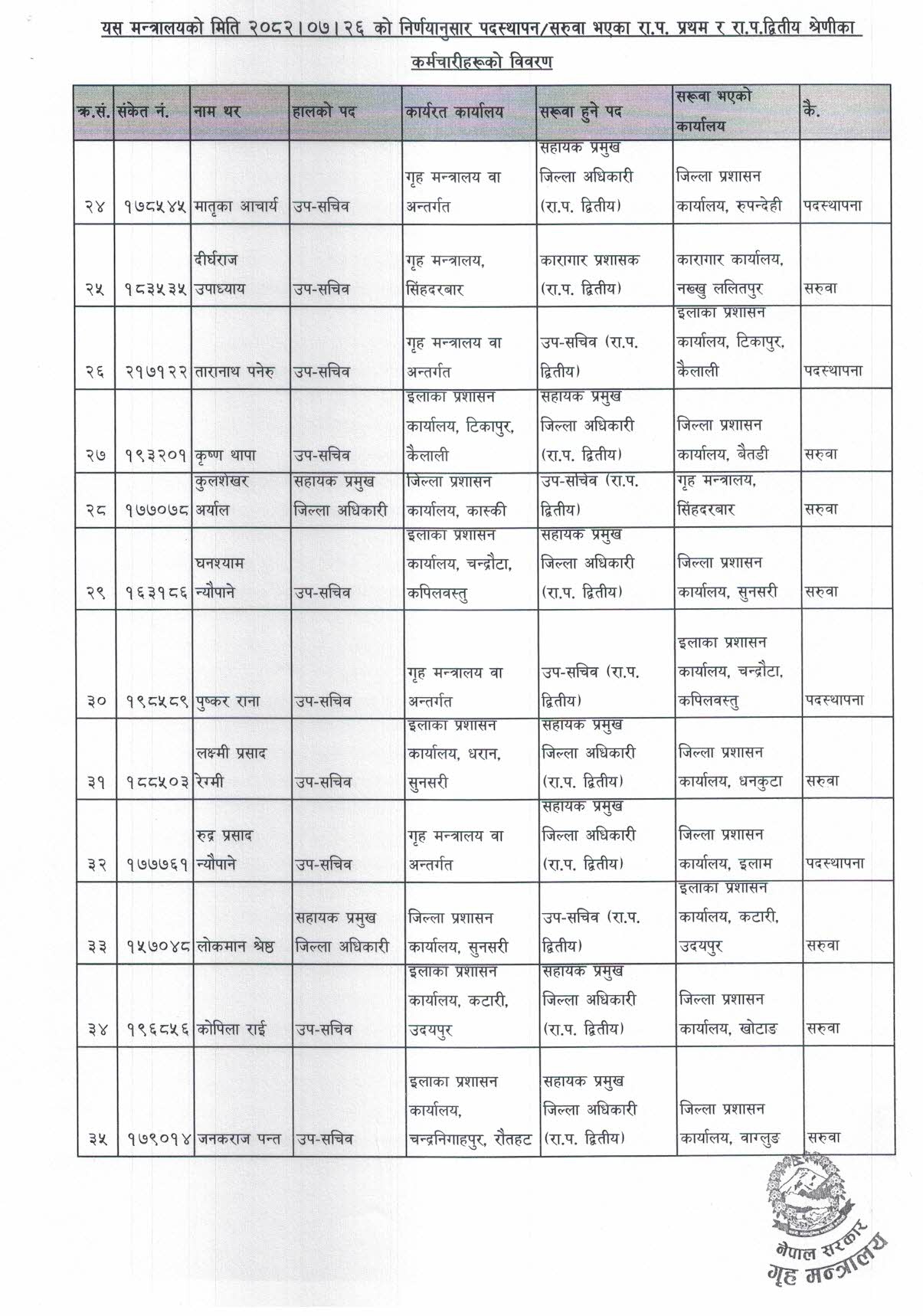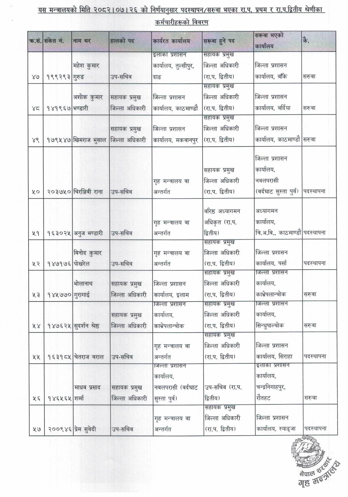 गृह मन्त्रालयद्वारा ७ जिल्लाका सीडीओसहित ५८ कर्मचारीको सरुवा