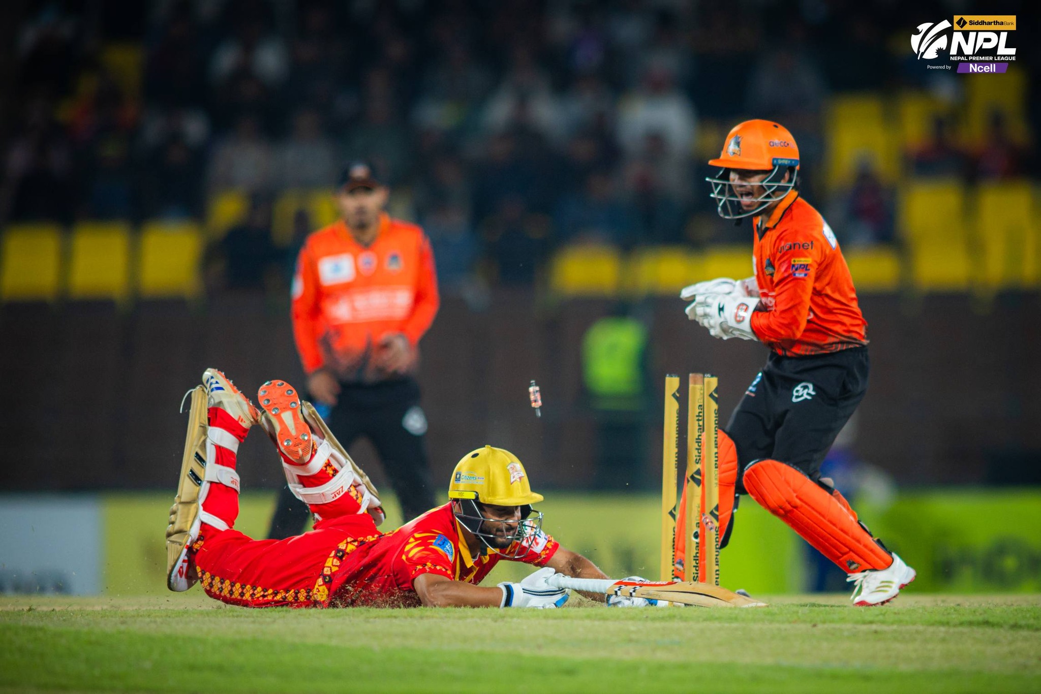 यसअघि टस हारेर पहिले ब्याटिङ गरेको चितवन राइनोजले निर्धारित २० ओभरमा ७ विकेट गुमाउँदै १४२ रन बनाएको थियो। रवि बोपाराको ६६ रनको शानदार पारीले चितवनलाई सम्मानजनक स्कोर दिलायो। कप्तान कुशल मल्लले २१, सैफ जैबले १५, अर्जुन साउदले अविजित १५, देव खनालले १४ तथा दीपक बोहराले १० रन जोडे।
