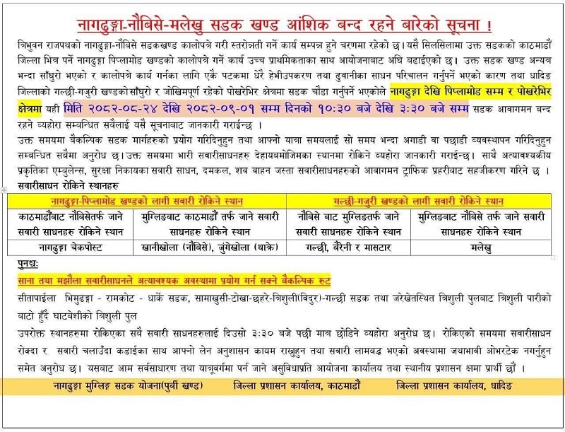 जिल्ला प्रशासन कार्यालय काठमाडौं र धादिङ तथा आयोजनाले जारी गरेको संयुक्त सूचनाअनुसार नागढुङ्गादेखि पिप्लामोड र पोखरेभिर क्षेत्रसम्म बिहान १०:३० बजेदेखि दिउँसो ३:३० बजेसम्म आवागमन बन्द हुनेछ। यात्रु र चालकहरूलाई वैकल्पिक मार्ग प्रयोग गर्न तथा आफ्नो यात्रा समय यस अवधिभन्दा अगाडि वा पछि मिलाउन अनुरोध गरिएको छ।