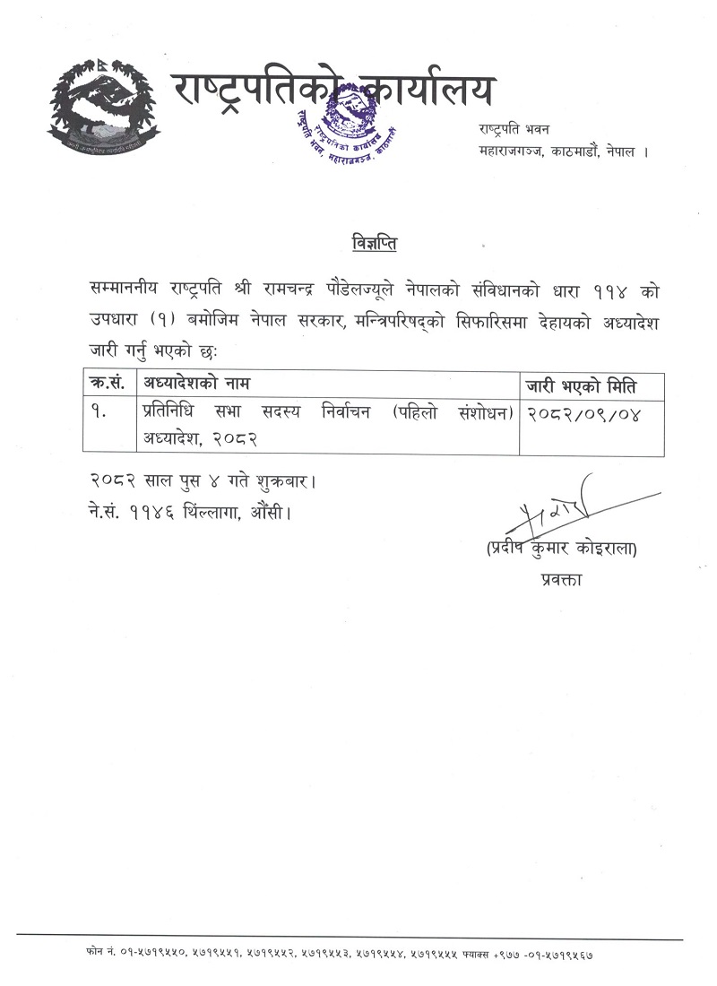 संविधानको धारा १९४ को उपधारा (१) बमोजिम मन्त्रिपरिषद्को सिफारिसमा राष्ट्रपति पौडेलले प्रतिनिधिसभा सदस्य निर्वाचन (पहिलो संशोधन) अध्यादेश २०८२ जारी गर्नुभएको हो।