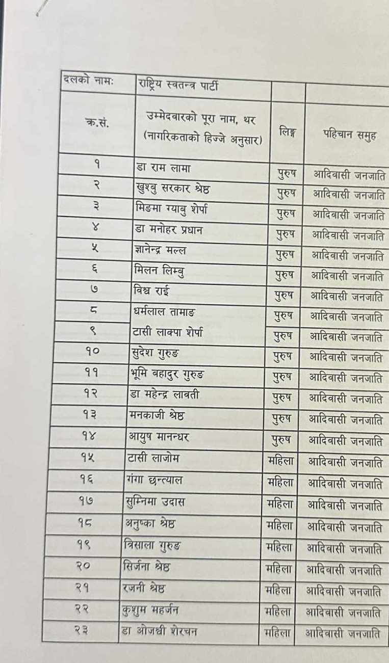 काठमाडौँ – राष्ट्रिय स्वतन्त्र पार्टी (रास्वपा) ले काठमाडौँ महानगरपालिकाका मेयर बालेन शाह तथा कुलमान घिसिङ नेतृत्वको उज्यालो नेपाल पार्टी पक्षलाई समेत समेट्दै निर्वाचन आयोगमा समानुपातिक उम्मेदवारको बन्दसूची पेश गरेको छ।