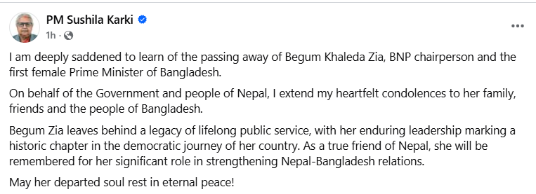 मंगलबार दिउँसो सामाजिक सञ्जाल फेसबुकमार्फत् शोक सन्देश जारी गर्दै प्रधानमन्त्री कार्कीले बङ्गलादेश नेसनालिस्ट पार्टी (बिएनपी) की अध्यक्षसमेत रहनुभएकी जियाको निधनले आफू अत्यन्तै दुःखी भएको उल्लेख गर्नुभएको छ।