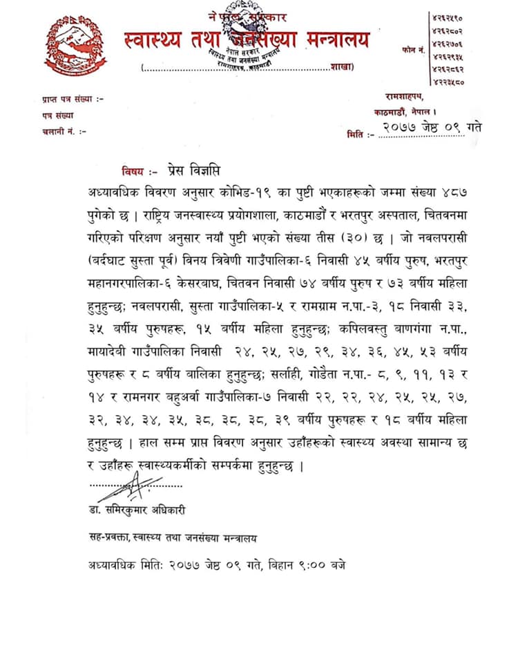 शुक्रबार विहान ३० जनामा कोरोना संक्रमणको पुष्टि भएको स्वास्थ्य तथा जनसंख्या मन्त्रालयले जनाएको छ । यो सँगै नेपालमा कोरोना संक्रमितको संख्या ४८७ पुगेको छ । संक्रमितहरु नवलपरासी (वर्दघाट सुस्ता पूर्व), चितवन, कपिलवस्तु, सर्लाहीका हुन् । उनीहरुको स्वास्थ्य अवस्था सामान्य रहेको मन्त्रालयले जनाएको छ ।