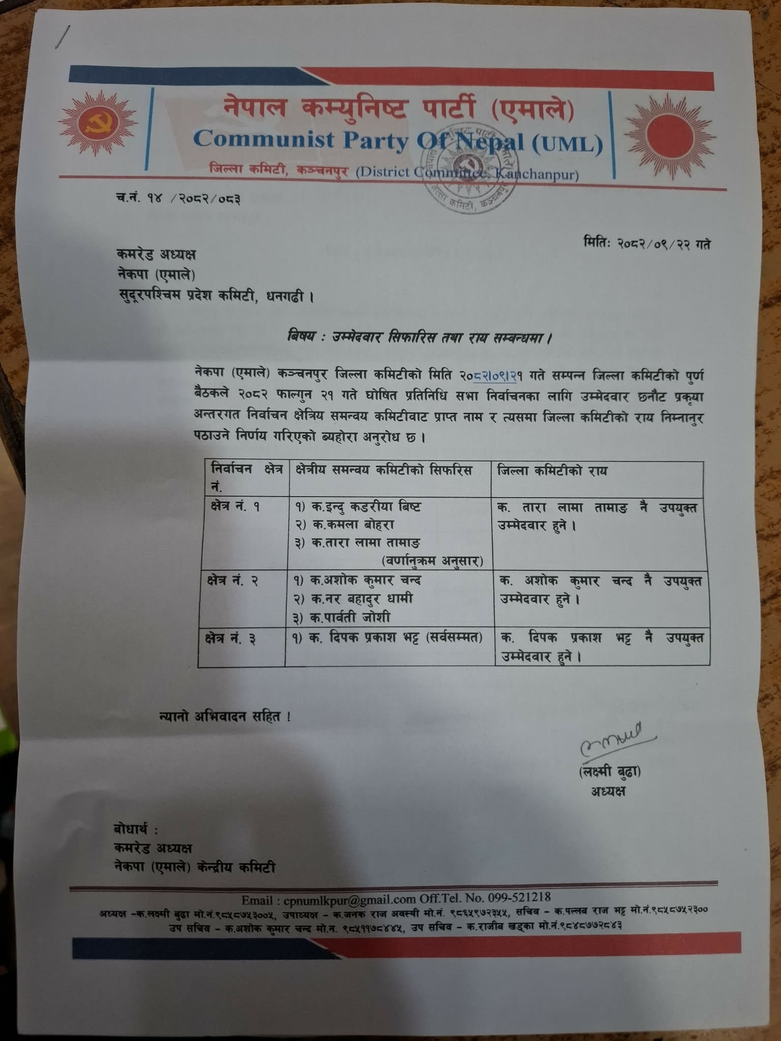 यसैगरी कञ्चनपुर क्षेत्र नम्बर २ को अवस्था अझै रोचक देखिएको छ। सो क्षेत्रमा उम्मेदवार छनोटका लागि एमाले कञ्चनपुर जिल्ला कमिटीले आन्तरिक निर्वाचन नै गरेको थियो। आन्तरिक निर्वाचनबाट तीन जनाको नाम केन्द्रमा सिफारिस गरिएको थियो। जसमा पहिलो नम्बरमा पूर्व नगरप्रमुख समेत रहेका अशोक कुमार चन्द, दोस्रोमा पूर्व सांसद नरबहादुर बिष्ट र महिलातर्फ पार्वती जोशी रहेका थिए।