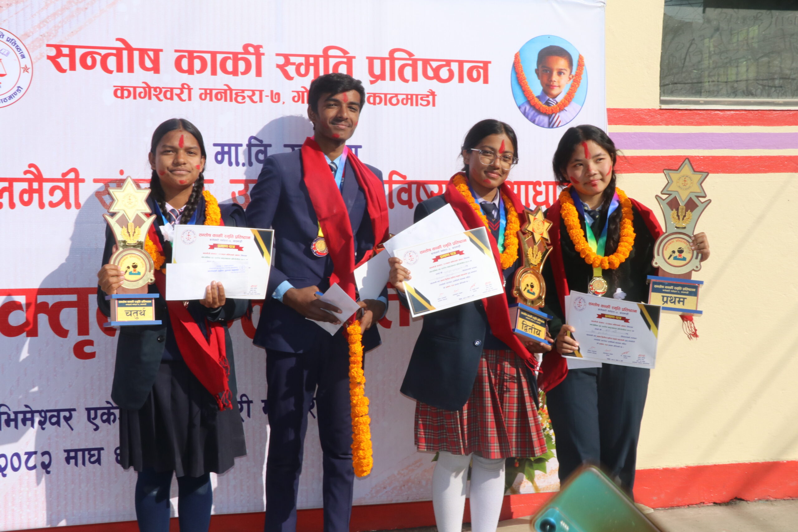 काठमाडौँ – सन्तोष कार्की स्मृति प्रतिष्ठानको आयोजनामा माध्यमिक विद्यालय स्तरीय “बालमैत्री संस्कार, उज्जवल भविष्यको आधार” विषयक वक्तृत्वकला प्रतियोगिता सम्पन्न भएको छ। कागेश्वरी मनोहरा-९ स्थित भीमेश्वर एकेडेमीमा आज माघ ६ गते मंगलबार सम्पन्न प्रतियोगिताको सभापतित्व डा. बासुदेव कार्कीले गर्नुभएको थियो। कार्यक्रममा कागेश्वरी मनोहरा नगरपालिकाकी उपप्रमुख शान्ता थापा प्रमुख अतिथि रहनु भएको थियो भने हिरा थोकर विशेष अतिथिका रूपमा सहभागी हुनुहुन्थ्यो।