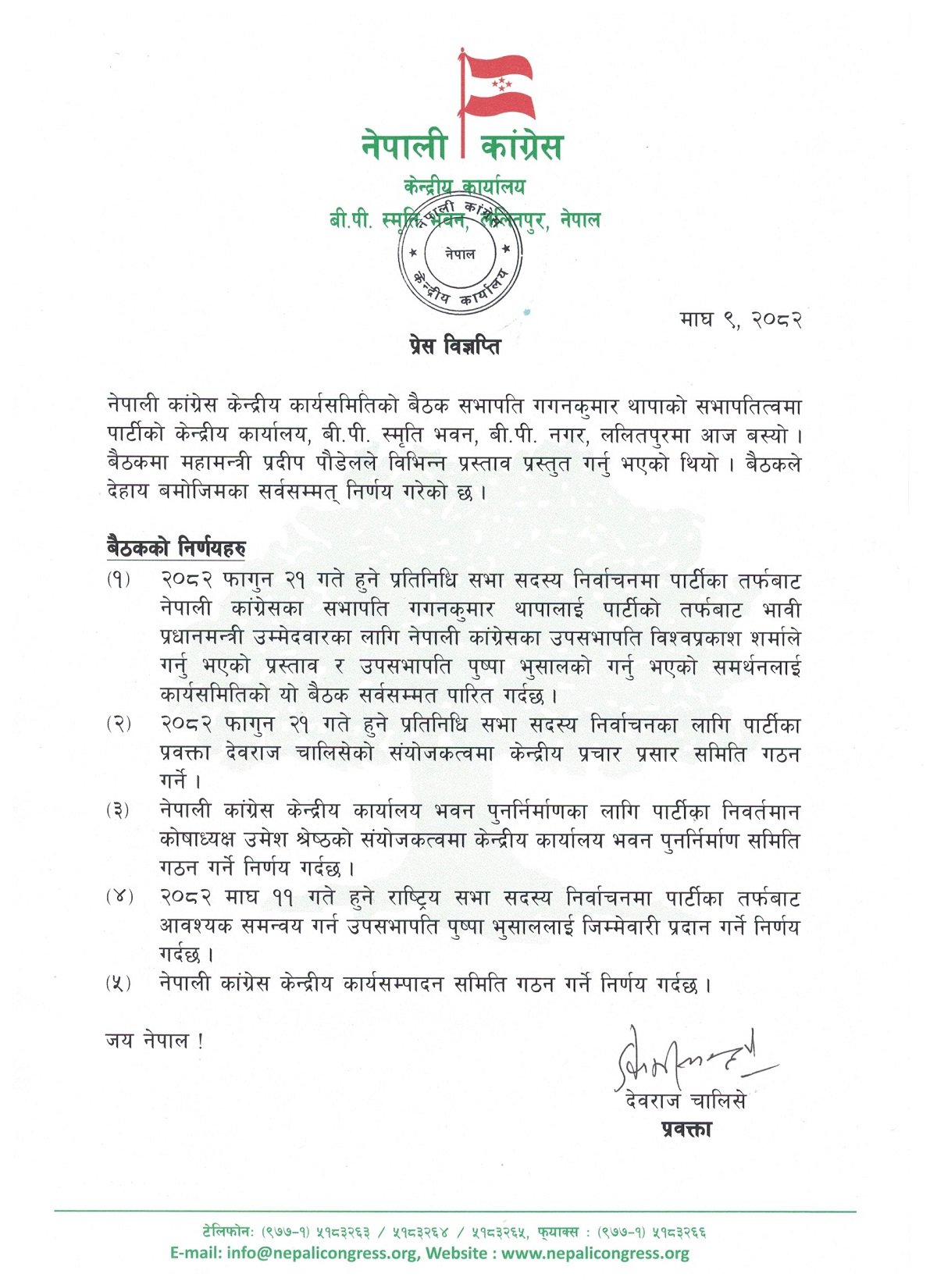 पहिलो, २०८२ फागुन २१ गते हुने प्रतिनिधिसभा सदस्य निर्वाचनमा नेपाली कांग्रेसका सभापति गगनकुमार थापालाई पार्टीको तर्फबाट भावी प्रधानमन्त्रीको उम्मेदवार बनाउने उपसभापति विश्वप्रकाश शर्माले पेस गर्नुभएको प्रस्ताव र उपसभापति पुष्पा भुसालले गर्नुभएको समर्थनलाई केन्द्रीय कार्यसमिति बैठकले सर्वसम्मत रूपमा पारित गरेको छ।