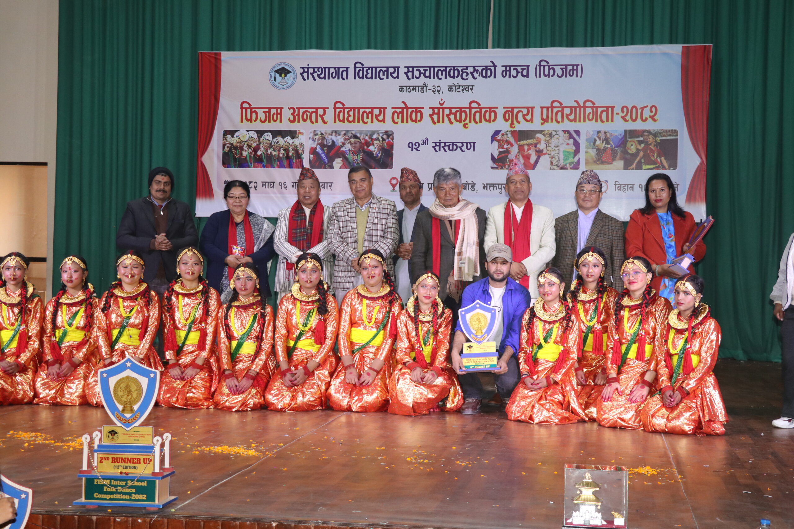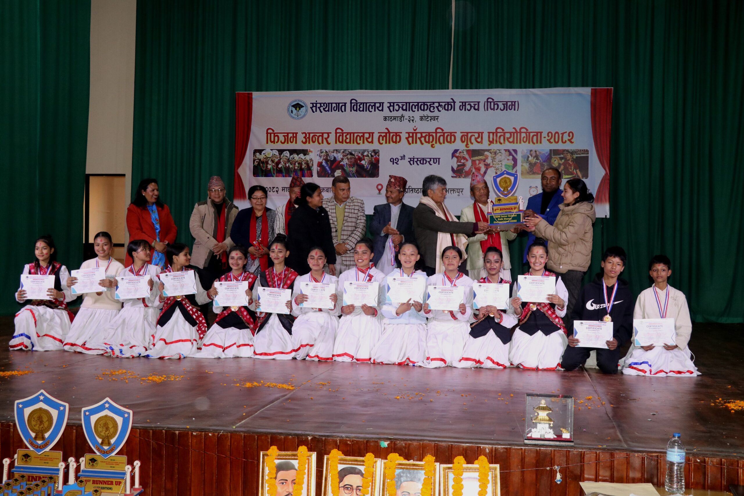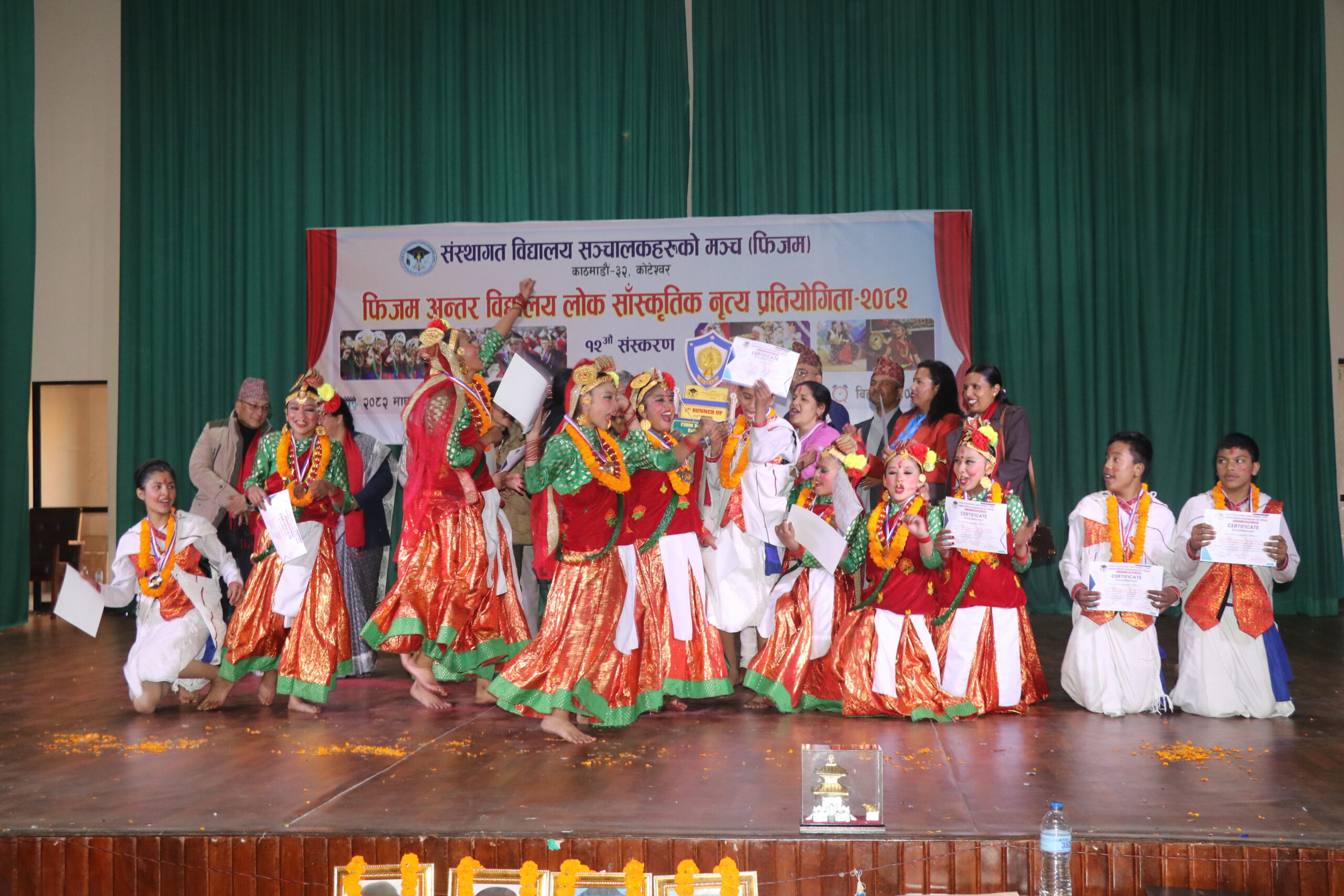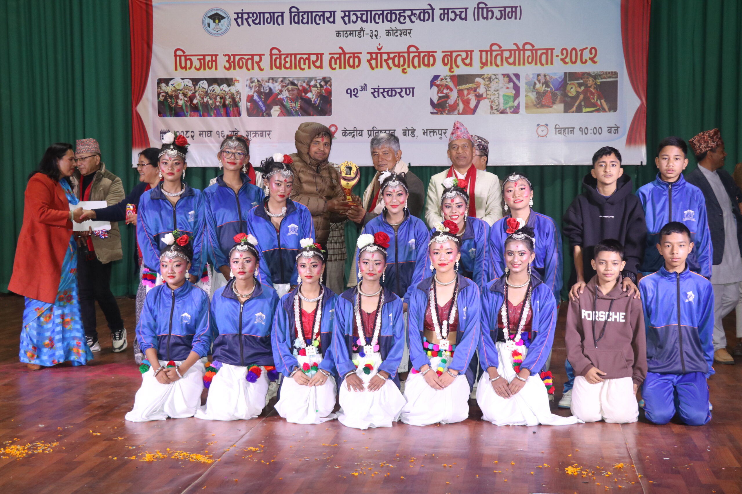काठमाडौँ – संस्थागत विद्यालय सञ्चालकहरूको मञ्ज (फिजम) द्वारा आयोजित फिजम अन्तर–विद्यालय लोक सांस्कृतिक नृत्य प्रतियोगिता २०८२ को १२औँ संस्करण भक्तपुरको बोडेस्थित कृषि विकास बैंक, केन्द्रीय प्रतिष्ठानमा सम्पन्न भएको छ। प्रतियोगितामा विभिन्न संस्थागत विद्यालयहरूको सहभागिता रहेको थियो, जहाँ विद्यार्थीहरूले नेपाली लोकसंस्कृति, मौलिक नृत्य र परम्परागत पहिरनमार्फत आकर्षक प्रस्तुति दिएका थिए।
