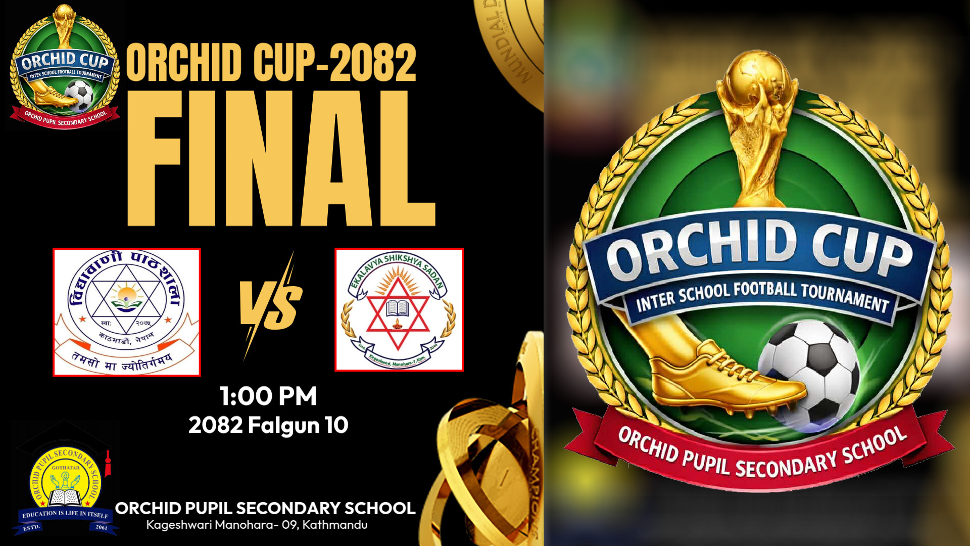 काठमाडौँ । काठमाडौँको गोठाटारस्थित अर्किड प्युपल सेकेण्डरी स्कुलमा जारी विद्यालयस्तरीय ‘अर्किड कप’ फुटबल प्रतियोगिताको फाइनल खेल आज हुँदैछ। सेमिफाइनल चरण पार गर्दै उपाधि नजिक पुगेका विद्यावाणी र एकलब्य शिक्षा सदनबीच आज उपाधिका लागि प्रतिस्पर्धा हुन लागेको हो।