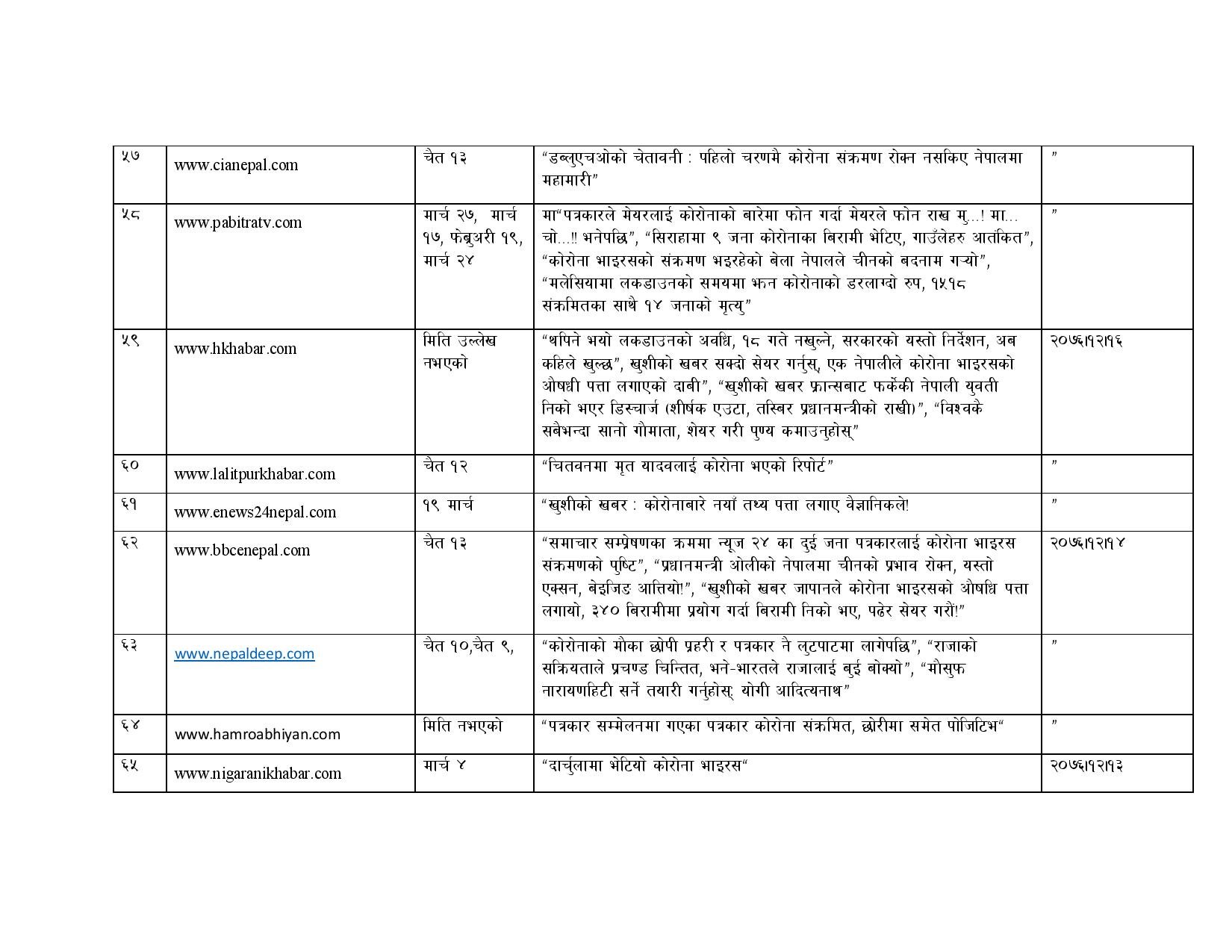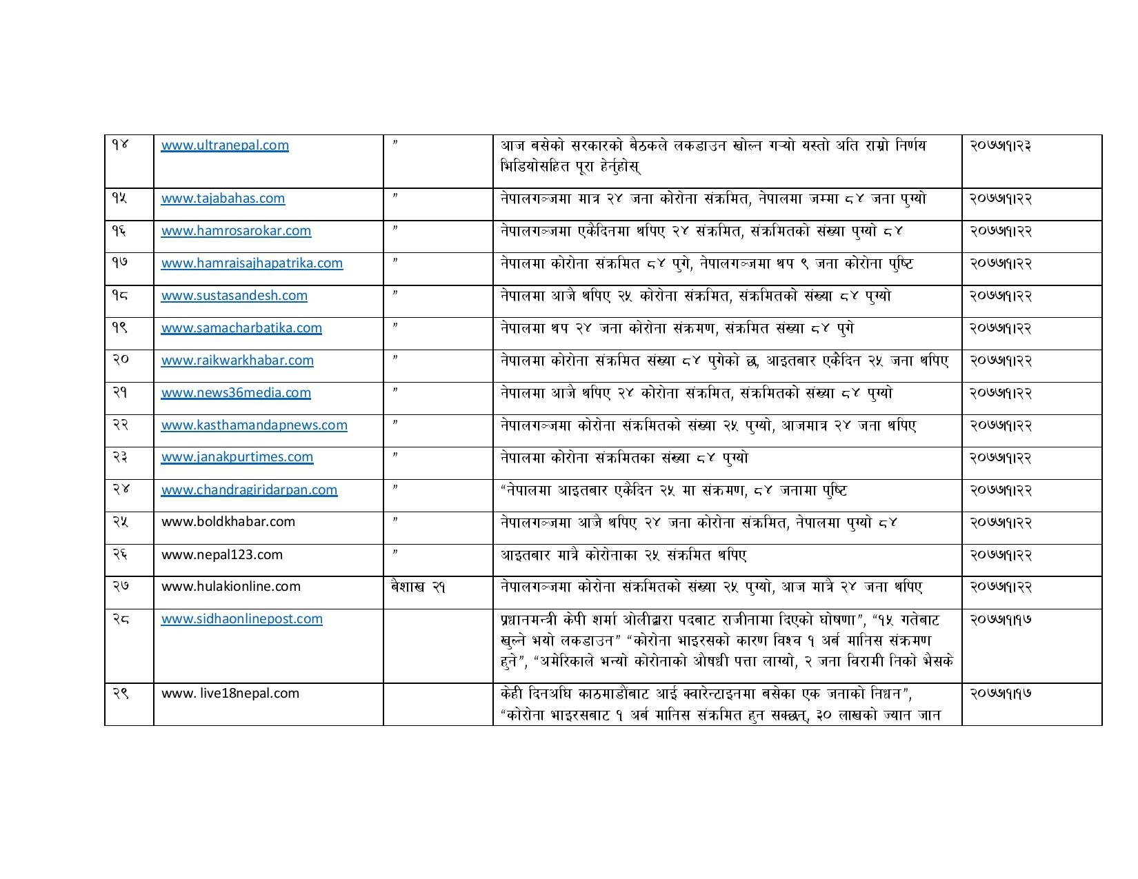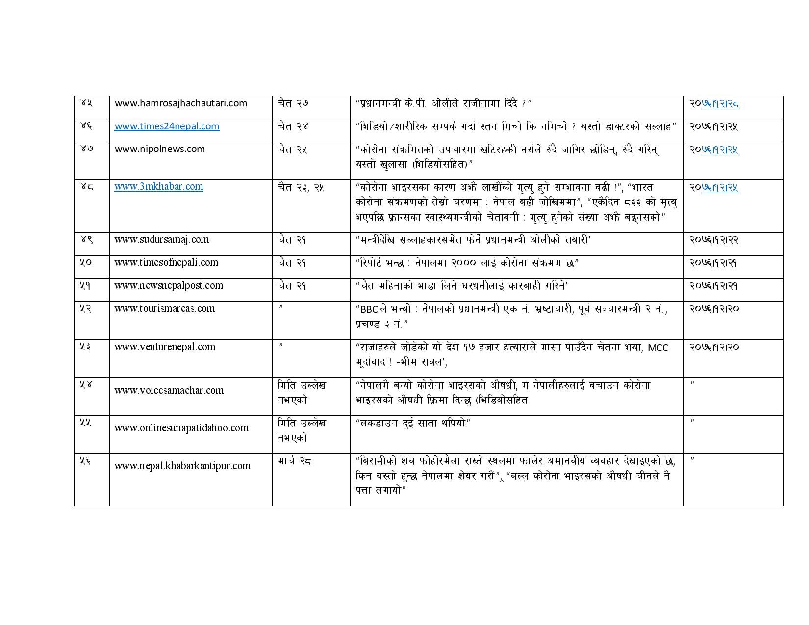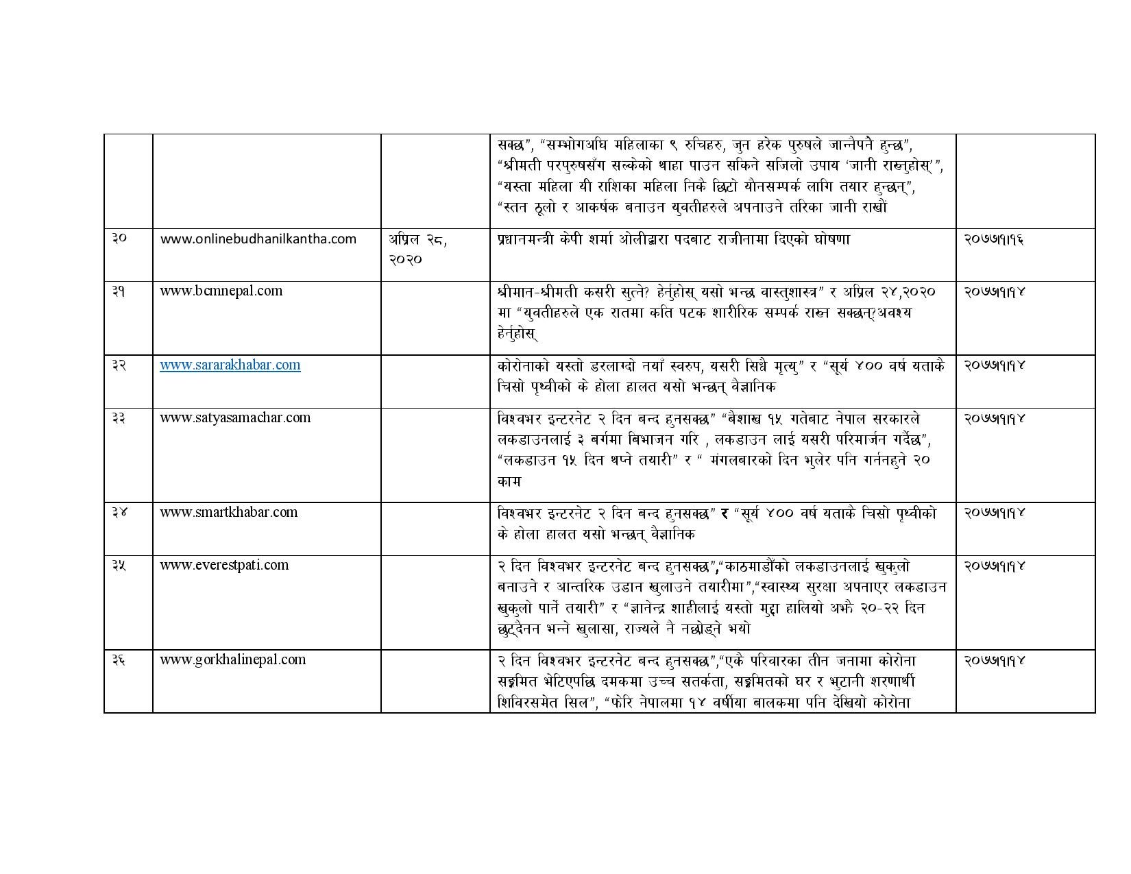 काउन्सिलिले २०७६ चैत १० गते देखि २०७७ जेठ ८ गते सम्म विभिन्न भ्रामक समाचार सम्प्रेषण गरेको भन्दै ७० वटा अनलाइन सञ्चारमाध्यमहरुलाई ब्लक गरेको जनाएको छ । यस्तै काउन्सिलले तथ्यहीन समाचार सम्प्रेण गरेर भ्रम फैलाउने १ सय ३६ अनलाइनहरुलाई स्पष्टीकरण सोधिएको जनाएको छ ।