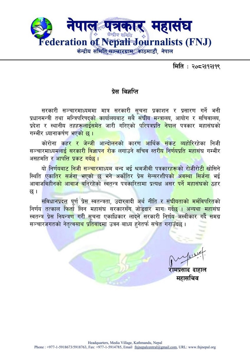 काठमाडौँ – सरकारी सूचना तथा विज्ञापन सरकारी सञ्चारमाध्यममार्फत मात्र प्रकाशन तथा प्रसारण गर्ने सरकारको निर्णयप्रति नेपाल पत्रकार महासङ्घले आपत्ति जनाएको छ। महासङ्घले आज विज्ञप्ति जारी गर्दै प्रधानमन्त्री तथा मन्त्रिपरिषद्को कार्यालयबाट सबै सङ्घ, प्रदेश तथा स्थानीय तहमा पठाइएको परिपत्रप्रति गम्भीर ध्यानाकर्षण भएको जनाएको हो।