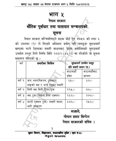 काठमाडौँ- सरकारले काठमाडौँको मुख्य प्रवेश नाका नागढुङ्गा सुरुङमार्ग प्रयोग गर्ने सवारीसाधनका लागि शुल्क दर सार्वजनिक गरेको छ। भौतिक पूर्वाधार तथा यातायात मन्त्रालयले राजपत्रमार्फत सुरुङमार्ग प्रयोगबापत तिर्नुपर्ने दस्तुर तोकेको हो।
