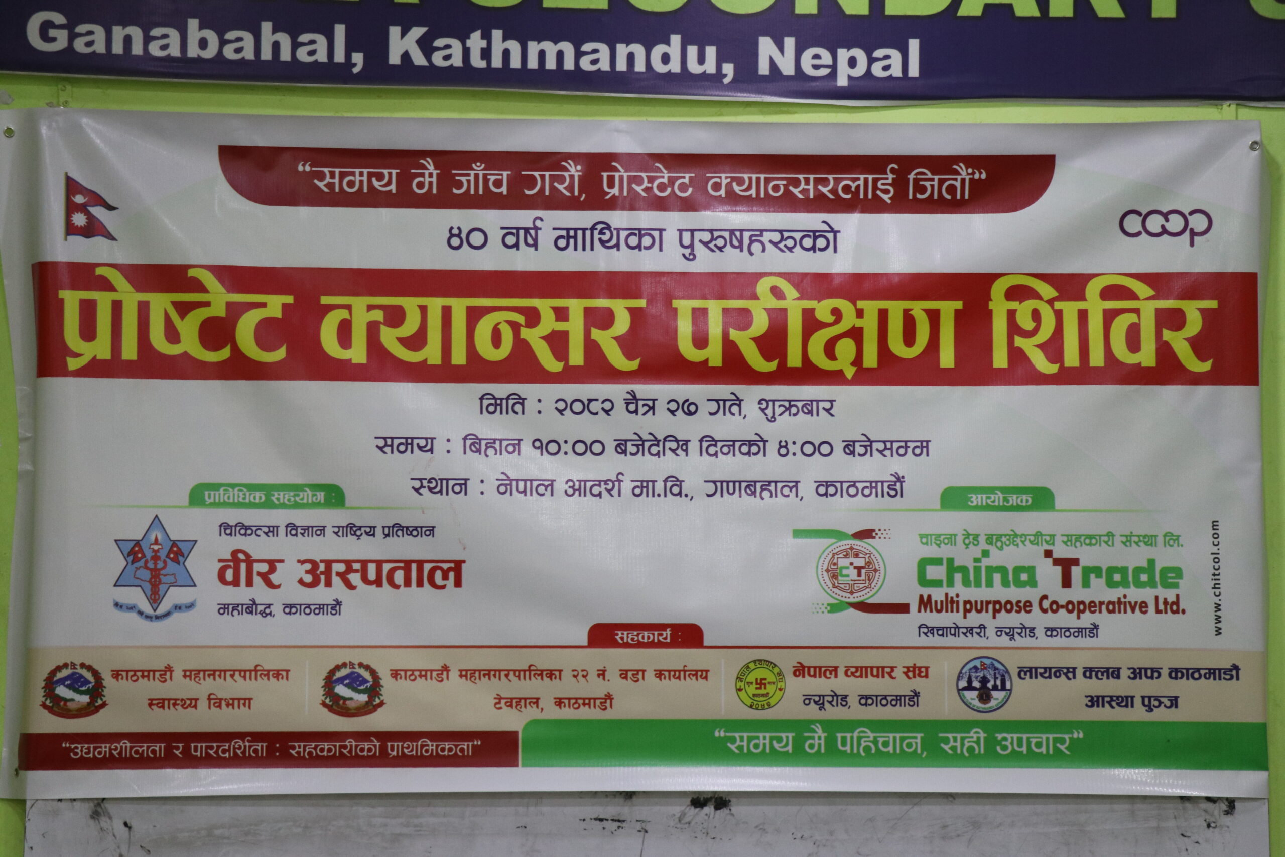 काठमाडौं – ६९औँ राष्ट्रिय सहकारी दिवस २०८२ को अवसरमा चाइना ट्रेड बहुउद्देश्यीय सहकारी संस्था लिमिटेडले निःशुल्क प्रोष्टेट क्यान्सर परीक्षण गरेको छ । काठमाडौँको न्यूरोड खिचापोखरीमा कार्यालय रहेको चाइना ट्रेड बहुउद्देश्यीय सहकारी संस्थाले शुक्रबार “समयमै जाँच गरौँ, प्रोष्टेट क्यान्सरलाई जितौँ” भन्ने मूल नाराका साथ ४० वर्षमाथिका पुरुषहरूको निःशुल्क प्रोष्टेट क्यान्सर परीक्षण कार्यक्रम आयोजना गरेको हो।