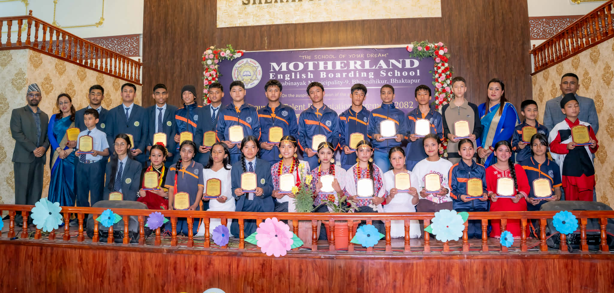 शैक्षिक वर्ष २०८२ मा विविध विधामा सर्वोत्कृष्ट हुन सफल विद्यार्थीहरुलाई सम्मान एवं बधाई गरिएको कार्यक्रममा कार्यक्रममा मदरल्याण्ड स्कुलको लागि पालिका, जिल्ला, प्रदेश, राष्ट्रिय र अन्तर्राष्ट्रिय स्तरमा २०८२ मा पदक भित्र्याउने ५६ जना विद्यार्थीहरुलाई सम्मान गरिएको थियो ! शैक्षिक वर्ष २०८२ मा वर्षभरि विविध विधामा उत्कृष्ट हुने १५ विद्यार्थीहरु र शिक्षकलाई समेत सम्मान गरिएको गरिएको थियो ! साथै शैक्षिक वर्ष २०८२ मा कक्षागत उत्कृष्ट जिपिए र स्थान हासिल गर्ने विद्यार्थीहरुलाई सम्मान तथा पुरस्कृत गरिनुको साथै प्रिस्कुल देखि कक्षा ३ सम्मका अपग्रेड हुने सबै विद्यार्थीहरुलाई कक्षा स्तरोन्नति सम्मान गरिएको थियो ।