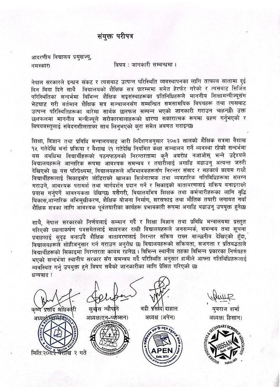 संयुक्त रूपमा जारी गरिएको परिपत्रमा नेपाल सरकारले सातामा दुई दिन सार्वजनिक बिदा दिने निर्णयसँगै शैक्षिक सत्रको सुरुवातमा समेत हेरफेर गरेको सन्दर्भमा शिक्षा क्षेत्र प्रभावित नहोस् भन्ने उद्देश्यले सरोकारवालाहरूबीच छलफल भएको उल्लेख गरिएको छ। सो क्रममा शिक्षामन्त्रीसँग भएको भेटघाटमा वर्तमान शैक्षिक सत्र सञ्चालनसँग सम्बन्धित समसामयिक विषयमा सार्थक संवाद भएको र मन्त्रीले सरोकारवालाहरूको धारणा सकारात्मक रूपमा ग्रहण गरेको जनाइएको छ।