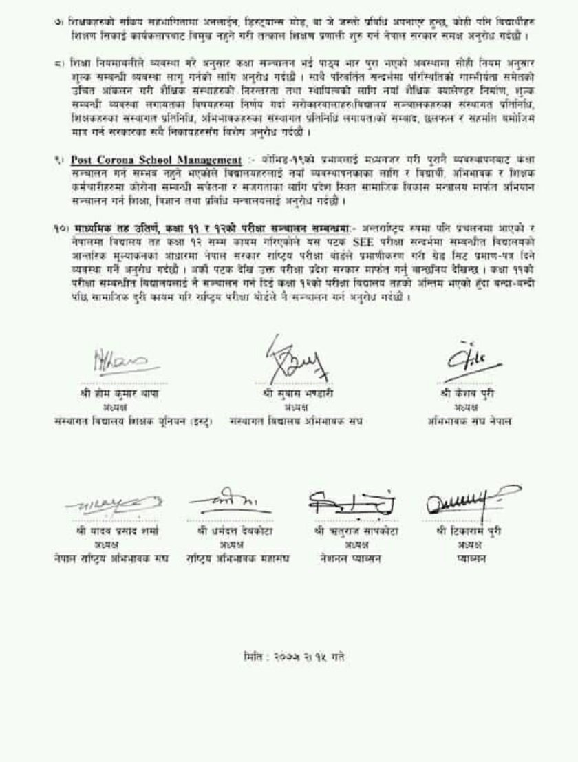 ती संघ संगठनले पछिल्लो जटिल परिस्थितिमा विद्यार्थी भर्ना प्रक्रिया, पाठ्यपुस्तक व्यवस्थापन, भर्चुअल कक्षा सञ्चालन गर्ने लगायत १० बुँदे धारणा सार्वजजिक गर्दै त्यसको कार्यान्वयनमा सहयोग गर्न सरकारसँग माग गरेका छन् । संगठनले जेठ २१ गतेदेखि विद्यार्थी भर्ना प्रक्रिया सुरु गर्न र शिक्षक कर्मचारीहरु विद्यालयमा उपस्थित भई नयाँ शैक्षिक सत्रका लागि योजना बनाउनुका साथै शिक्षक कर्मचारीहरुलाई तालिम अभिमुखीकरणका लागि व्यवस्था मिलाउन सरकारसँग अनुरोध गरेका छन् ।