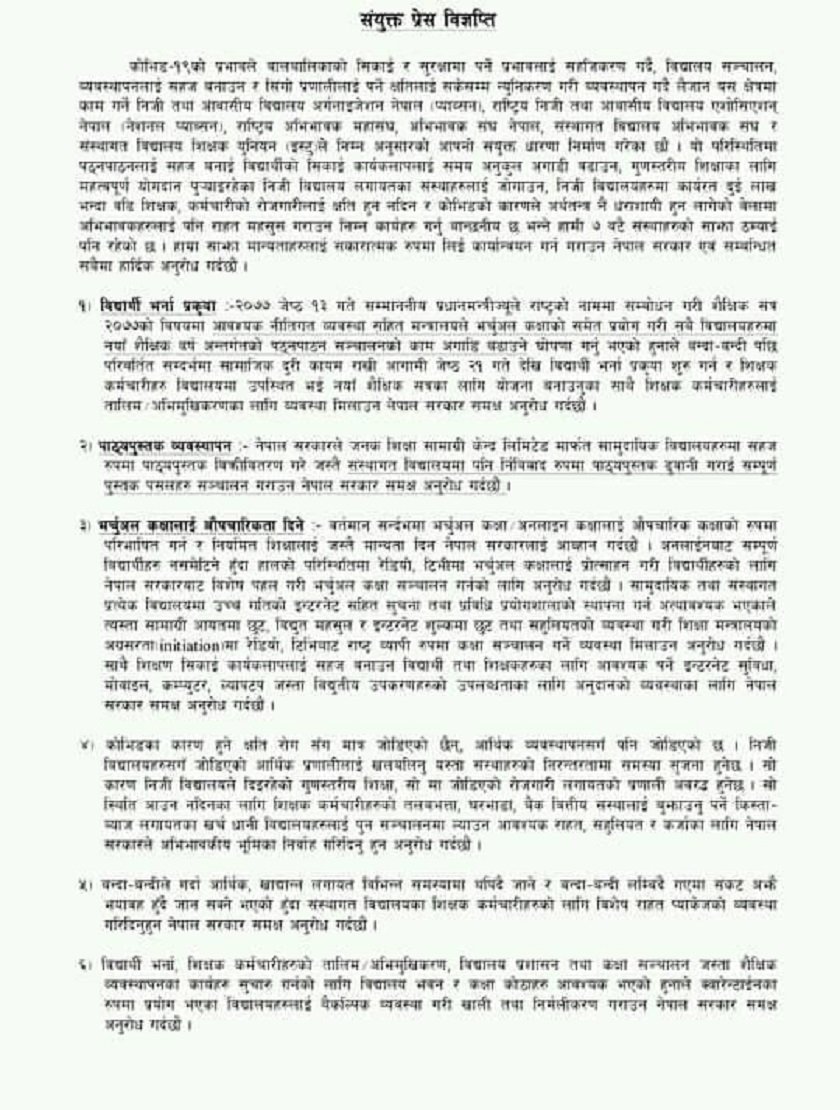 सात संगठनद्वारा बिहीबार जारी संयुक्त विज्ञप्तिमा निर्विवाद रुपमा पाठ्यपुस्तक ढुवानी गराई सम्पूर्ण पुस्तक पसलहरु सञ्चालन गराउन र अनलाइनबाट समेत सम्पूर्ण विद्यार्थीहरु नसमेटिने हुँदा रेडियो, टिभीमा भर्चुअल कक्षालाई प्रोत्साहन गरी विद्यार्थीहरुका लागि सरकारबाटै विशेष पहल गरी भर्चुअल कक्षा सञ्चालन गर्न आग्रह गरिएको छ ।