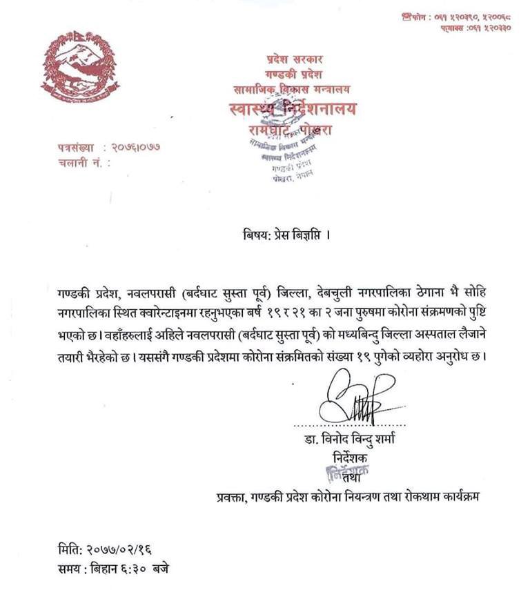 भारतपुर अस्पताल कोभिड–१९ प्रयोगशालामा देवचुली नगरपालिका १५ र ११ नवलपुर बस्ने २१ र १९ वर्षका पुरुषमा कोरोना संक्रमणको पुष्टि भएको हो ।