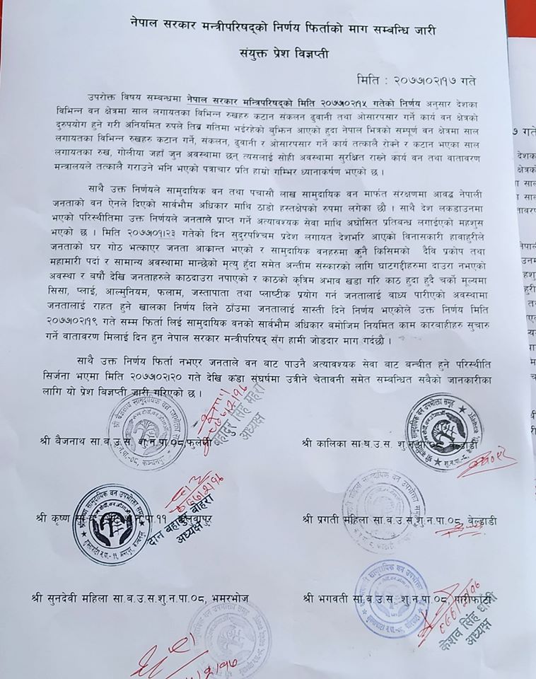 लकडाउनको समयमा उक्त निर्णयले जनताले प्राप्त गर्ने अत्यावश्यक सेवा माथि सरकारले अघोषित प्रतिबन्ध लगाएको समितिहरुको ठहर छ । विज्ञप्तिमा भनिएको छ, “काठको कृत्रिम अभाव खडा गरि काठ हुदाहुदै चर्को मुल्यमा सीसा, प्लाई, आल्मुनियम, फलाम, जस्तापाता, तथा प्लाष्टिक प्रयोग गर्न जनतालाई बाध्य पारिएको अवस्थामा जनतालाई राहत हुने खालका निर्णय लिने ठाउँमा जनतालाई सास्ती दिने निर्णय भएकाले उक्त निर्णय मिति २०७७।०२।१९ गते सम्म फिर्ता लिई सामुदायिक वनको सार्वभौम अधिकार बमोजिम नियमित काम कारवाहीहरु सूचारु गर्ने वातावरण मिलाइदिन हुने नेपाल सरकार मन्त्रिपरिषद्सँग हामी जोडदार माग गर्दछौँ ।”