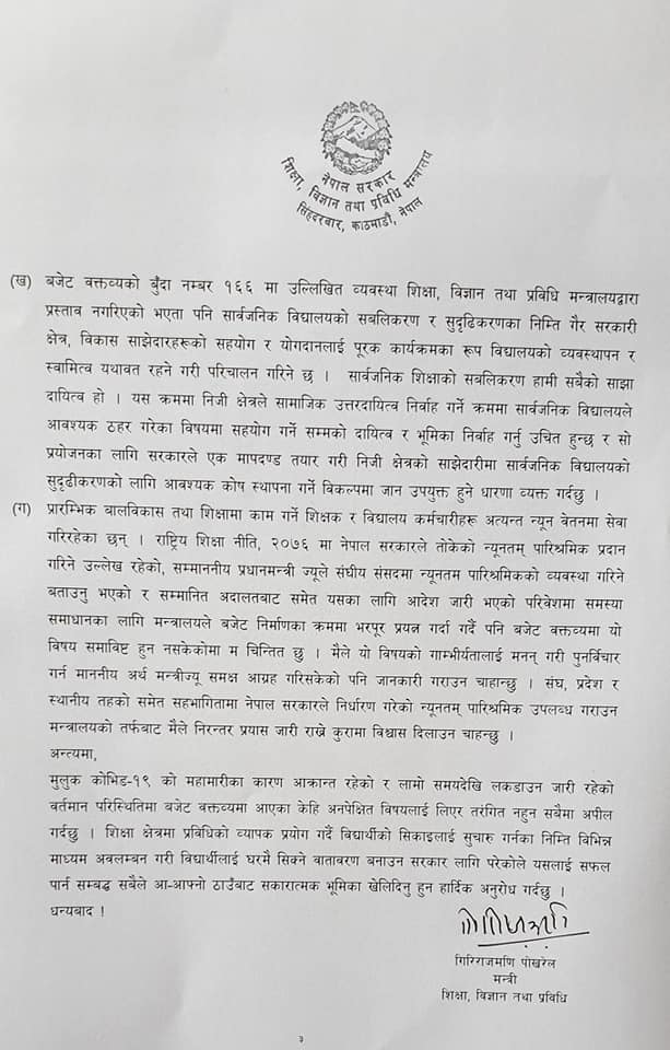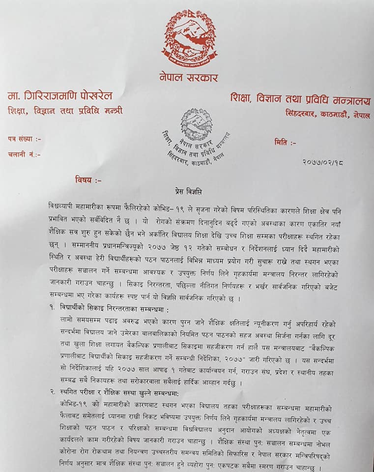 शिक्षा विज्ञान तथा प्रविधिमन्त्री गिरीराजमणी पोखरेलले आइतबार विज्ञप्ति जारी गर्दै लामो समयसम्म पढाई अवरुद्ध भएका कारण पुग्न जाने शैक्षिक क्षतिलाई न्युनीकरण गर्न अपरिहार्य रहेको भन्दै विद्यालय जाने उमेर समूहका बालबालिकाको नियमित पठान पाठनको सहज अवस्था सिर्जना गर्न दुर तथा खुल्ला शिक्षा लगायत बैकल्पिक प्रणालीबाट सिकाइमा सहजीकरण गर्न हालै मन्त्रालयले वैैकल्पिक प्रणालीबाट सिकाई सहजीकरण गर्ने सम्बन्धि निर्देशिका २०७७ जारी गरेको जनाएका छन् ।