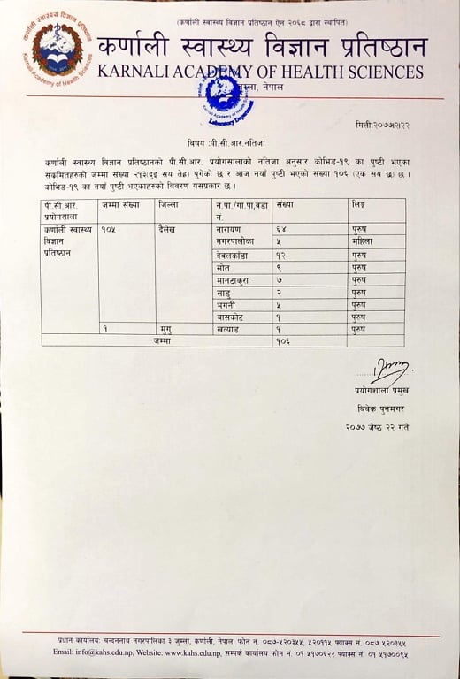 प्रतिष्ठानका प्रयोगशाला प्रमुख विवेक पुन मगरले एक विज्ञप्तिमार्फत बिहीबार १०६ जनामा संक्रमण पुष्टि भएको जानकारी दिएका हुन् ।