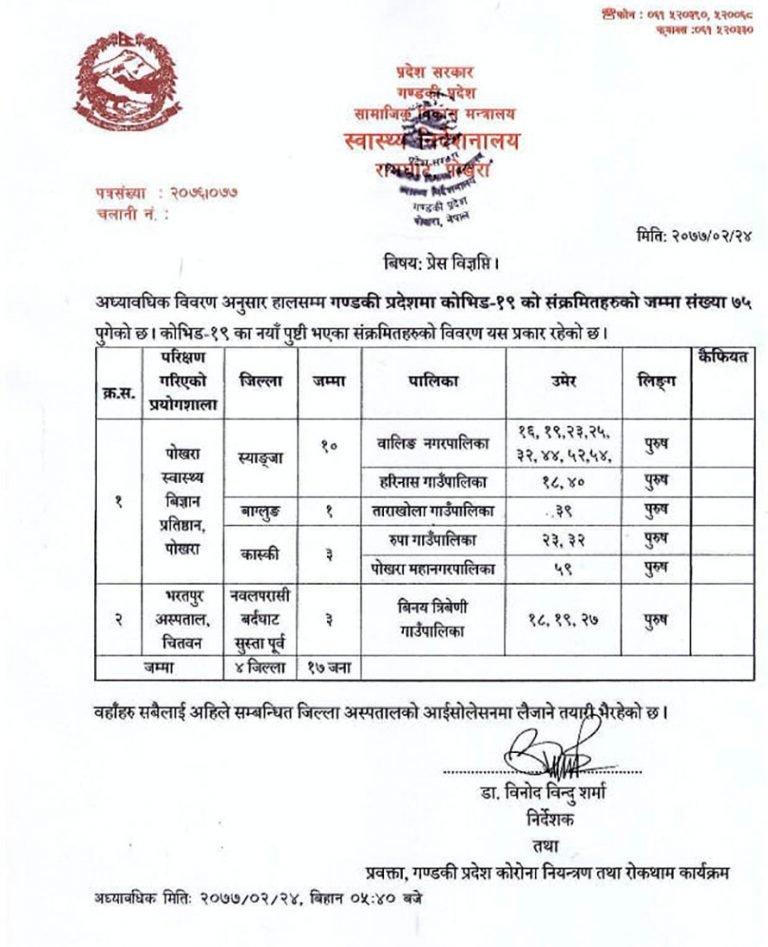 यो सँगै गण्डकीमा संक्रमित कुल संख्या ७५ पुगेको छ । स्वास्थ्य निर्देशनालयले दिएको जानकारी अनुसार कास्की, स्याङ्जा, बागलुङ र नवलपुरमा गरि १७ संक्रमित थपिएका हुन् ।