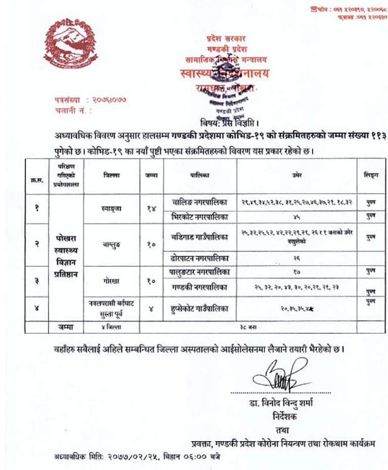 काठमाडौं – गण्डकी प्रदेशमा थप ३८ जनामा कोरोना भाइरस संक्रमण पुष्टि भएको छ । स्याङजामा १४, गोरखामा १०, बागलुङमा १० र नवलपरासी बर्दघाट सुस्ता पूर्वमा ४ जना नयाँ संक्रमित फेला परेको प्रदेश स्वास्थ्य निर्देशनालयले जनाएको छ ।