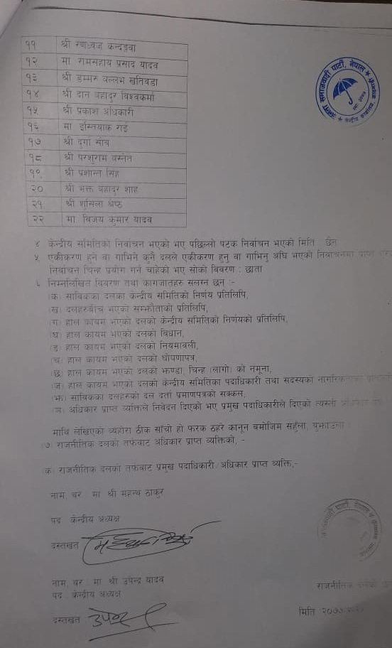 काठमाडौं – जनता समाजवादी पार्टी निर्वाचन आयोगमा दर्ता भएको छ । महन्थ ठाकुर र उपेन्द्र यादव केन्द्रीय कार्यसमिति अध्यक्ष भएका छन् । यस्तै, डा.बाबुराम भट्टराई, राजेन्द्र महतो र अशोक राई वरिष्ठ नेताका रुपमा रहेका छन् ।