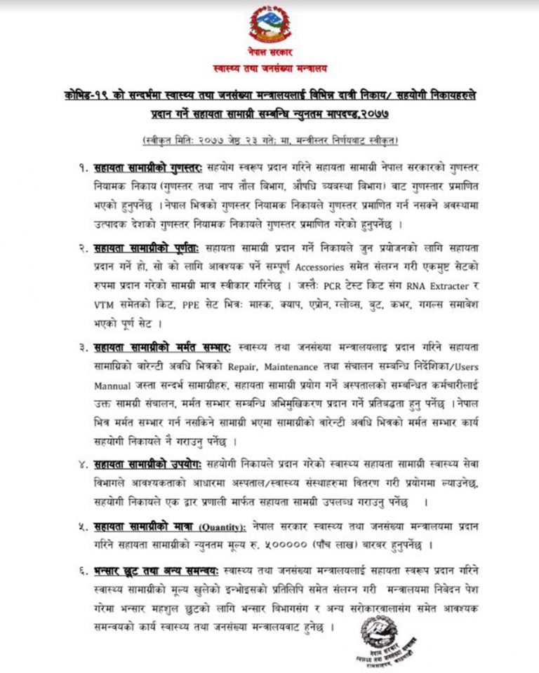 काठमाडौं – स्वास्थ्य तथा जनसंख्या मन्त्रालयले सहायता मापदण्ड तयार गरी ५ लाख भन्दा कम रकम बराबरको सहायता सामग्री नलिने भएको छ । कोभिड १९ को सन्दर्भमा स्वास्थ्य तथा जनसंख्या मन्त्रालयलाई विभिन्न दात्री निकायरसहयोगी निकायहरुले प्रदान गर्ने सहायता सामग्री समबन्धी न्युनत्तम मापदण्ड, २०७७ जारी गरी यस्तो निर्णय गरेको हो ।