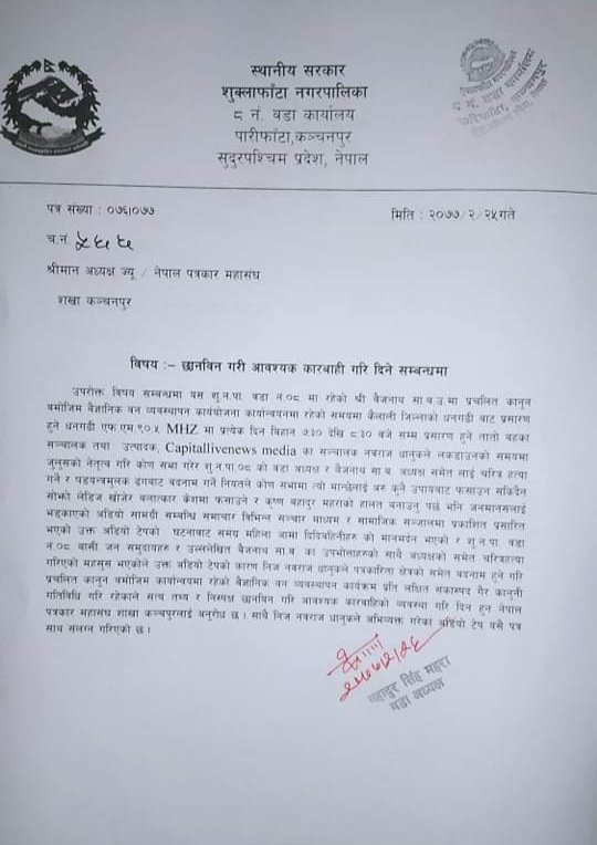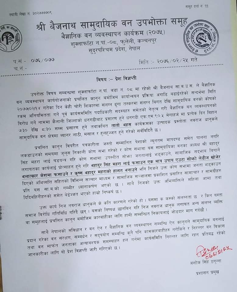 कञ्चनपुरकाे शुक्लाफाँटा नगरपालिका वडा नं. ८ तथा बैजनाथ सामुदायिक वन उपभोक्ता समुहका अध्यक्ष बहादुर सिँह महराकाे चरित्र हत्या गरेकाे तथा महिलाहरूकाे मानमर्दन भएकाे भन्दै वडा कार्यलयले आवश्यक अनुसन्धान गरि कारबाहीको लागि आईतवार पत्रकार महासंघ कञ्चनपुर शाखालाई अनुराेध गरेकाे हाे । यस्तै बैजनाथ सामुदायिक वन उपभोक्ता समुहले पनि सामाजिक सञ्जाल लगायत सञ्चारमाध्यममा प्रकाशित तथा प्रशारित अडियाे प्रति आपत्ति जनाउँदै धानुकलाई कारबाहीका लागि सम्बन्धित निकायलाई अनुराेध गरेकाे छ । आईतवार प्ररशासन प्रमुुख अशााेक सिँह ठगुन्नाद्वारा जारी विज्ञप्तिमा आपत्ति जनाउदै कारबाहिकाेे माग गरेेेेकाे हाे ।