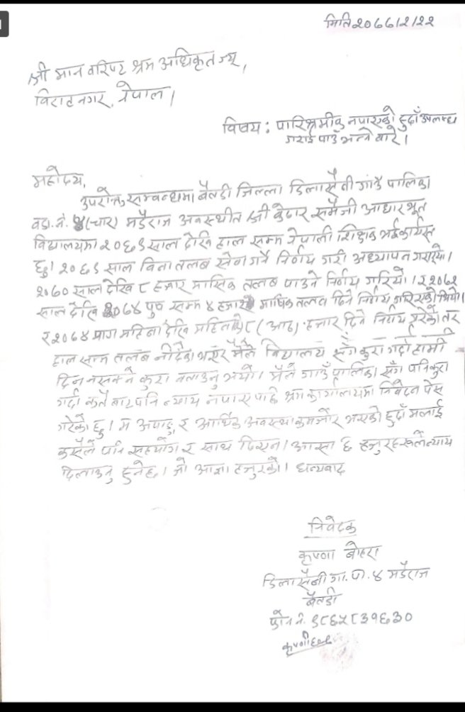 डिालासैनी गाउँपालिका वडा नं.–४ मा अवस्थित समैजी आधारभुत विद्यालयमा कार्यरत शिक्षिका बोहराले विगत ७ वर्ष देखि पारिश्रमिक पाएकी छ्रैनन् । उनले २०६९ सालमा विना तलब सेवा गर्ने निर्णय गरि अध्यापन सुरु गरेकी थिइन् तर २०७०साल देखि मासिक ८ हजार तलब दिने निर्णय गरियो । उनी भन्छिन्, “फेरी २०७२ साल २०७४ पुष सम्म मासिक ४ हजार तलब दिने निर्णय गरियो र फेरी २०७४ माघ देखि मासिक ८ हजार तलब दिने निर्णय गरियो । तर पनि आज सम्म तलब पाएको छैन ।” उनले तलब नपाएको कुरा सम्बन्धित विद्यालयमा राख्दा तलब दिन नसक्ने कुरा गरेको बताए । उता गाउँपालिकामा पनि कुरा गर्दा थाहा नभएको प्रतिक्रिया दिएको उनले बताए । ‘म अपाङ्ग र आर्थिक अवस्था कमजोर भएको हुँदा मलाई कसैले पनि साथ र सहयोग गरेन’ उनले भनिन् । तलब नपाएपछि उनले श्रम कार्यालयमा समेत निवेदन दिएको कुरा उल्लेख गरेकी छिन् ।