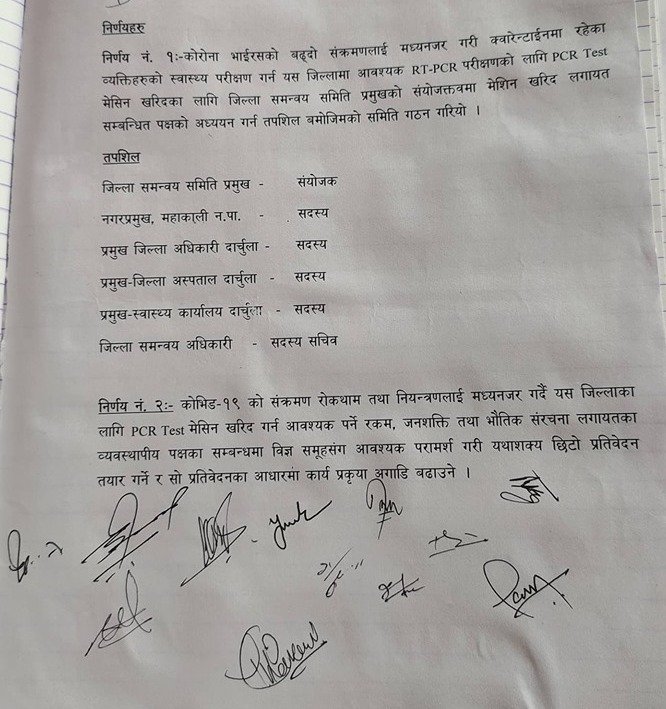 पीसीआर मेसिन खरिदको लागि प्रयोगशाला स्थापनाको अध्ययनको लागि जिल्ला समन्वय समितिका प्रमुख करवीर कार्कीको संयोजकत्वमा समिति गठन गरिएको छ । समितिले जिल्लामा पीसीआर टेस्ट गर्ने मेसिन खरिद गर्न आवश्यक बजेट, जनशक्ति तथा भौतिक संरचना लगायतका व्यवस्थापकीय पक्षका समन्बन्धमा विज्ञसँग छलफल गरि प्रतिवेदन तयार गर्ने जनाएको छ । समितिमा ६ सदस्य रहेका छन् ।