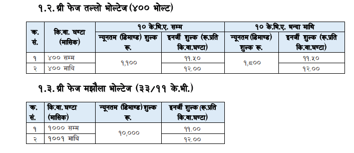 यस्तै ६० एम्पियरको लाइन जडान गर्नेले डिमाण्ड शुल्क १२५ रुपैयाँ र १० युनिटसम्म खपत गर्नेलाई प्रतियुनीट ६ रुपैयाँ तोकिएको छ ।