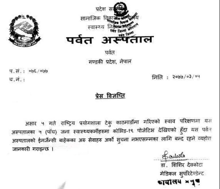 काठमाडौंको टेकुस्थित राष्ट्रिय प्रयोगशालामा गरिएको स्वाब परीक्षणमा पर्वत अस्पताका पाँच स्वास्थ्यकर्मीमा कोरोना पुष्टि भएको पर्वत अस्पतालका मेडिकल सुपरिटेन्डेन्ट डा. शिशिर देवकोटाले जानकारी दिए ।