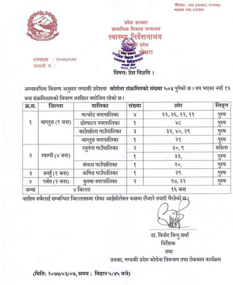 गण्डकी प्रदेश स्वास्थ्य निर्देशनालयले आइतबार विहान ५ः४५ बजे सार्वजनिक गरेको विवरण अनुसार बाग्लुङको गल्कोट नगरपालिकामा ४ जना र काठेखोला गाउँपालिकामा ३ जनामा कोरोना संक्रमण पुष्टि भएको हो ।