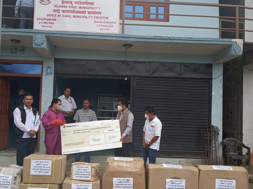 प्रदान गरिएका स्वास्थ्य सामग्रीमा पीपीई सेटलगायतका सामग्री २८ थान र केएन ९५ मास्क ५ सय थान रहेको छ । दीर्घरोगीहरुका लागि रु ५ लाखभन्दा बढीको औषधि उपलब्ध गराएको छ । हेलम्बु गाउँपालिकाका अध्यक्ष निमाग्याल्जेन शेर्पा र स्वास्थ्य शाखा प्रमुख ज्ञानेन्द्र सिग्देललाई संस्थाका कार्यक्रम व्यवस्थापक कृष्णकुमार दाहाल र वरिष्ठ अधिकृत रामनाथ राउतले शुक्रबार नगद तथा सामग्री हस्तान्तरण गर्नुभएको हो ।