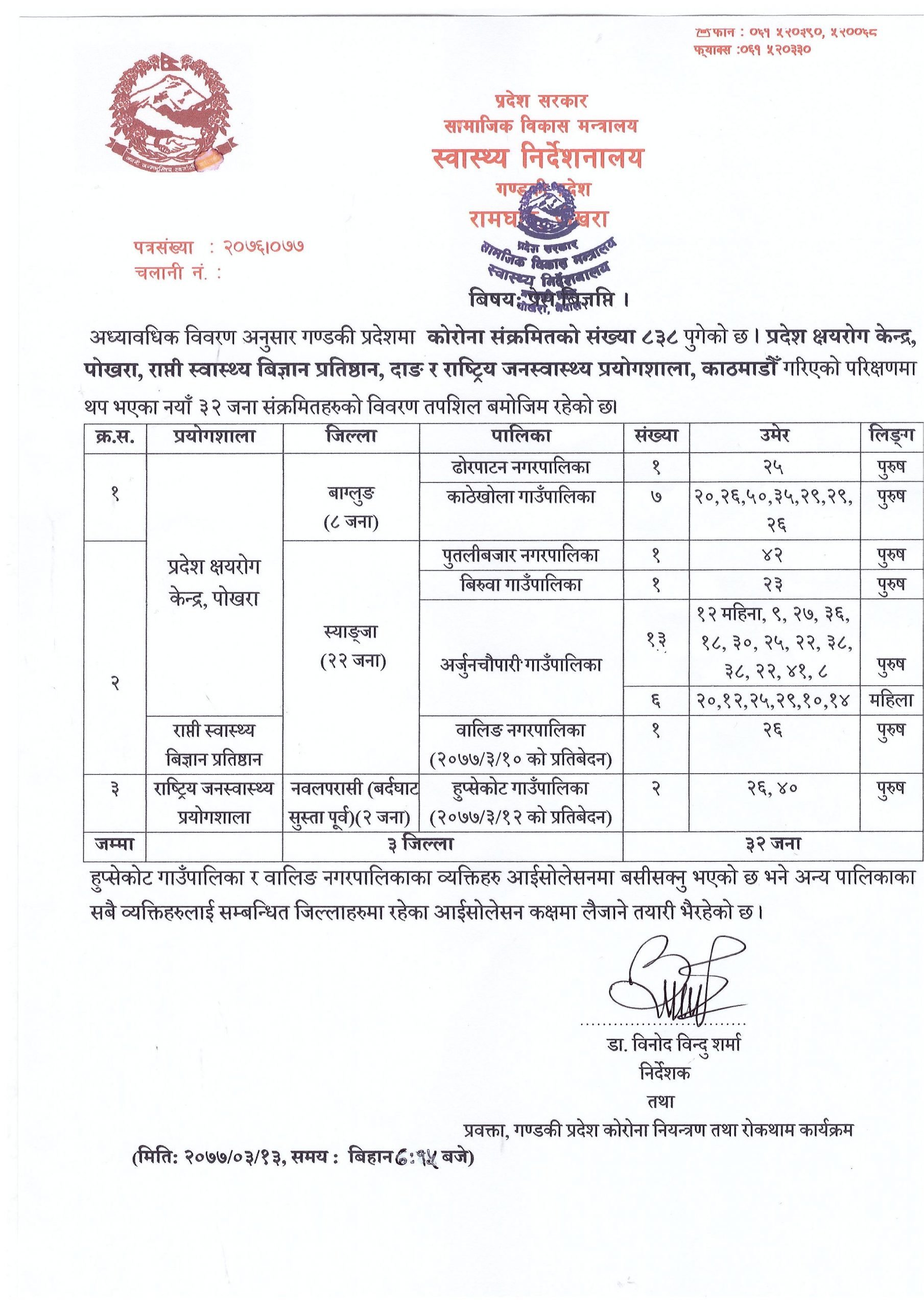 गण्डकी प्रदेशमा थप ३२ जनामा कोरोना सङ्क्रमण पुष्टि (विज्ञप्ती सहित)