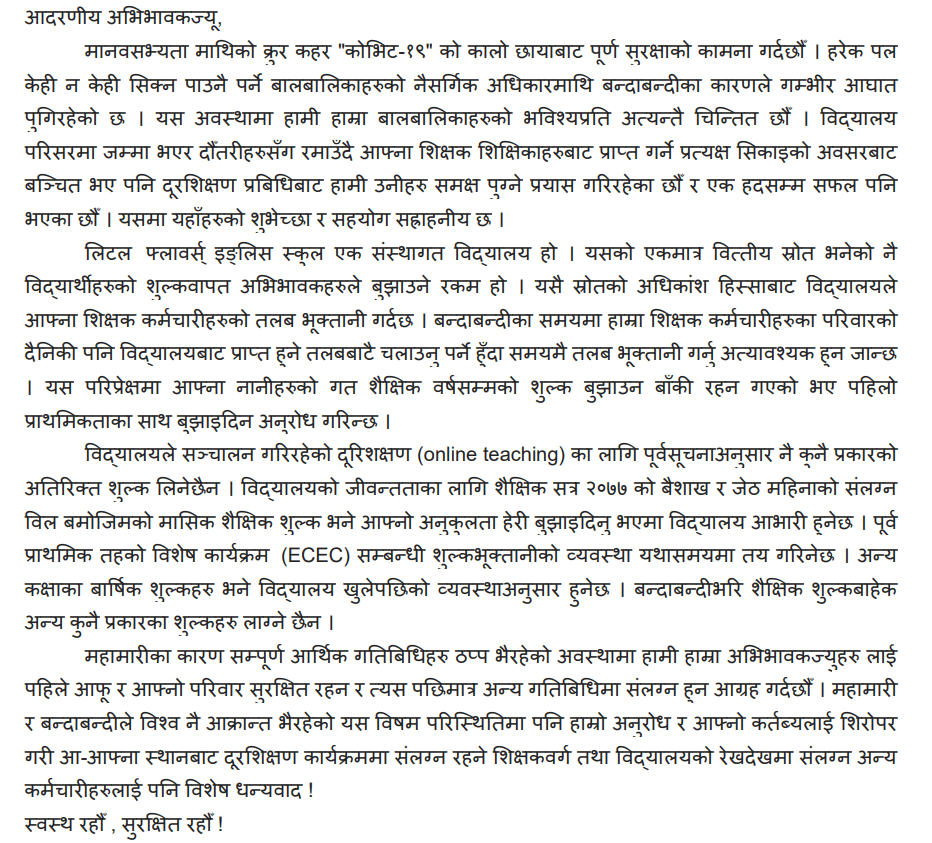 तर विद्यालयहरुले जवरजस्ती मोबाइल एसएमएस मार्फत होस् या आफ्नो अफिसियल वेबसाइटबाट होस विद्यार्थीहरुको बैशाख र जेठको शुल्क बुझाउन ताकेता गरेको पाइएको छ । झापाको विर्तामोडमा रहेको लिटिल फ्लावर्स इंग्लिस स्कुलले अभिभावकहरुलाई शुल्क बुझाउन ताकेता गरेको छ ।
